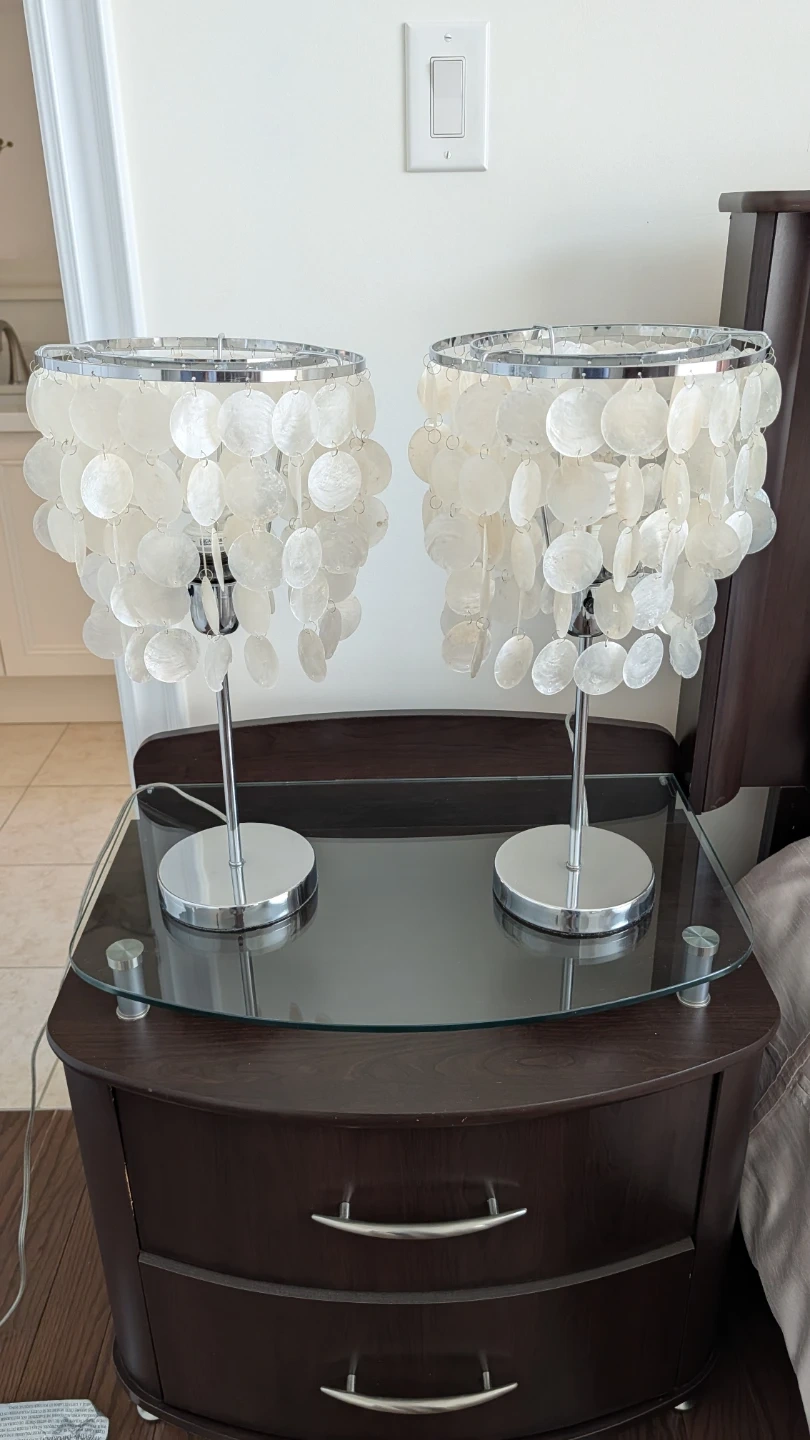 This pair of table lamps features a modern chrome base and a shade made of numerous white capiz shells. They're perfect for adding a soft, ambient glow to a bedroom or living space. The shell construction diffuses light beautifully.
