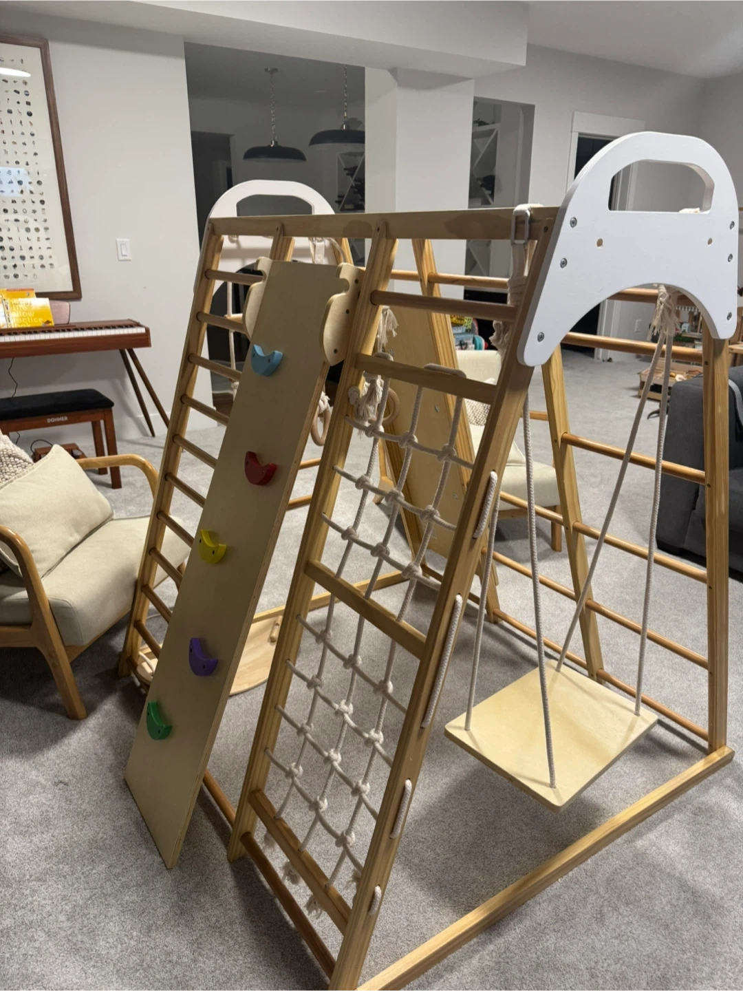 A versatile wooden indoor jungle gym set. It features a climbing wall with colourful holds, a rope net, a swing, and monkey bars. Great for active play indoors!
