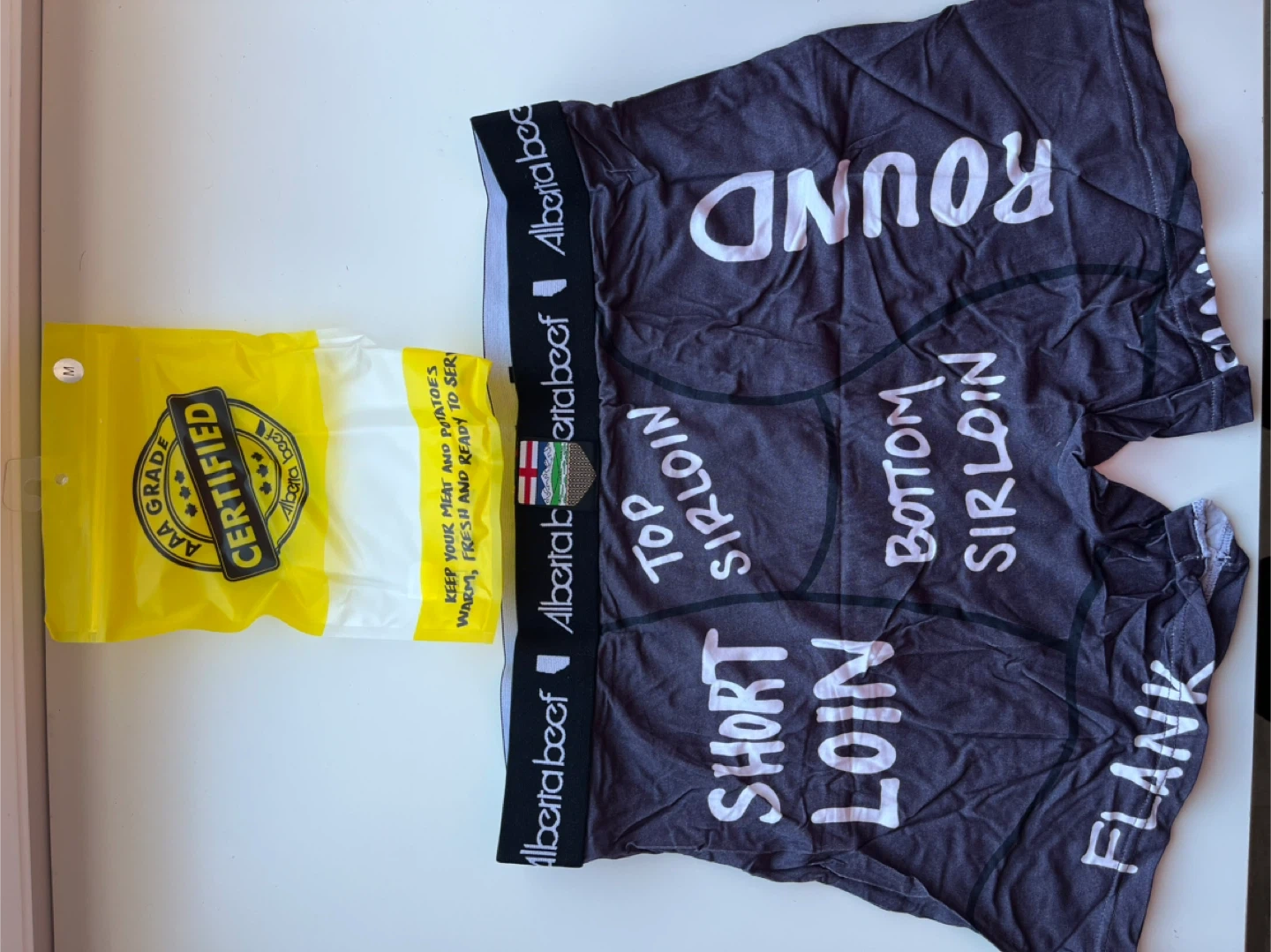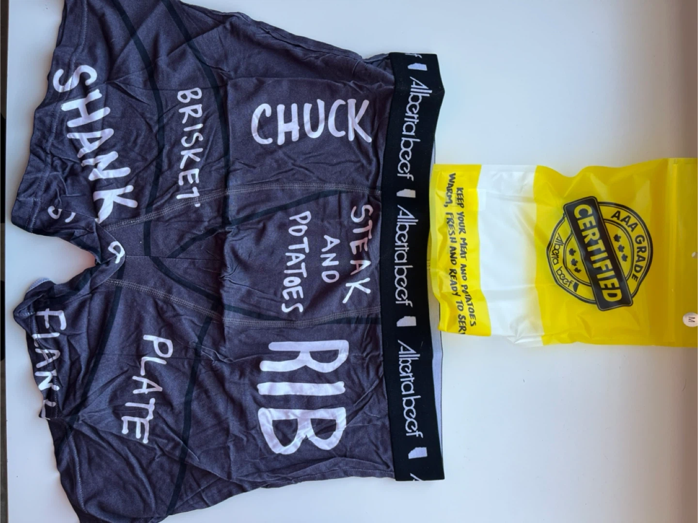 These fun boxer briefs feature a dark grey base with a print of various beef cuts and "Steak and Potatoes". The waistband is black with the "Alberta Beef" logo. It's a size medium.