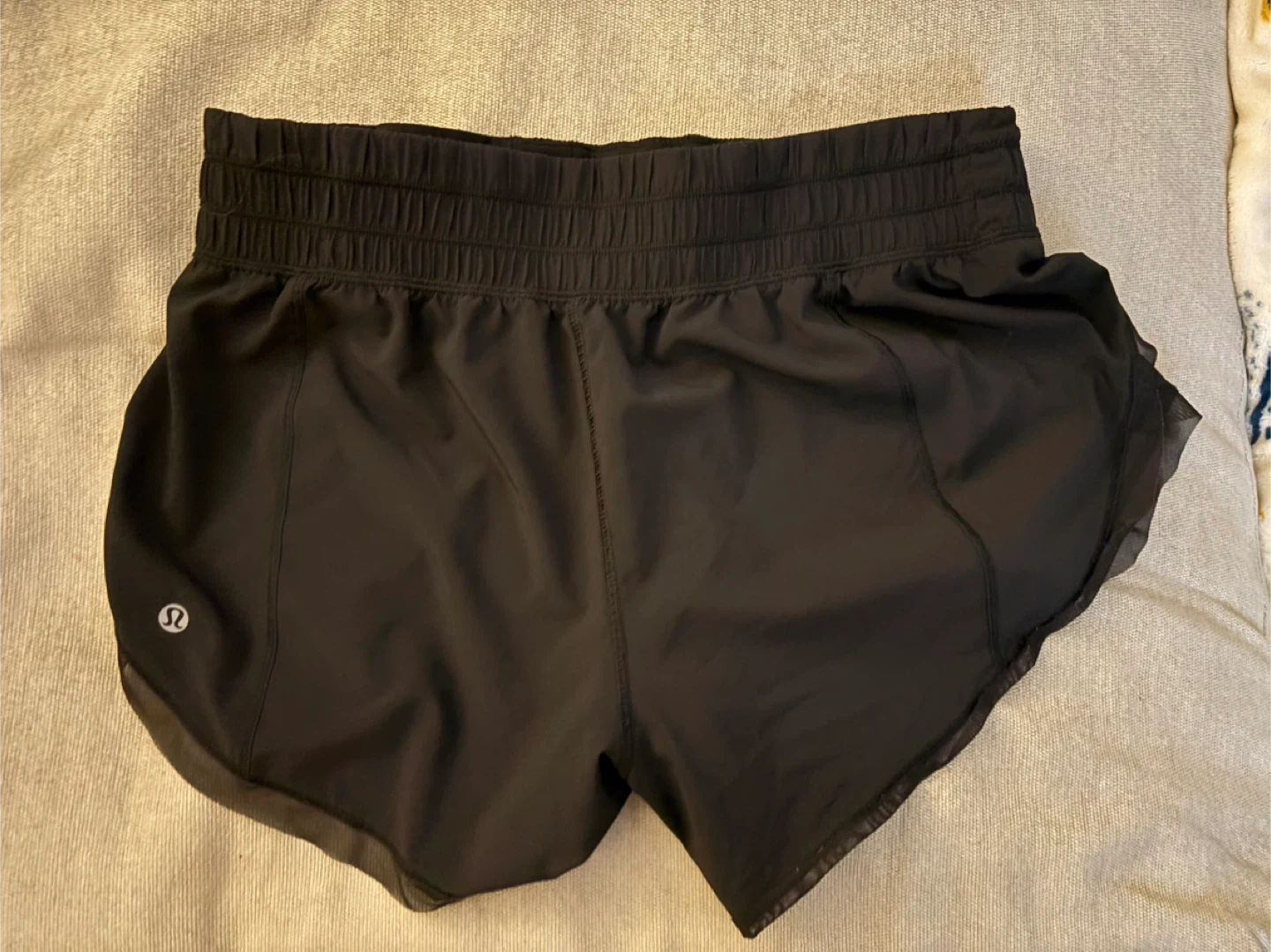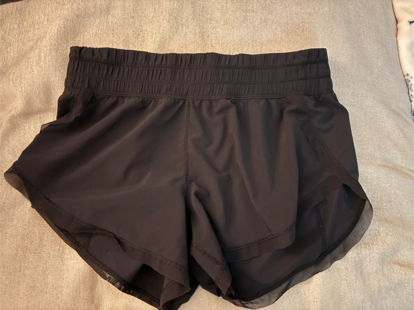 Lululemon black running shorts with a comfortable elastic waistband. These shorts are lightweight and designed for active wear. Perfect for your next run or workout session!