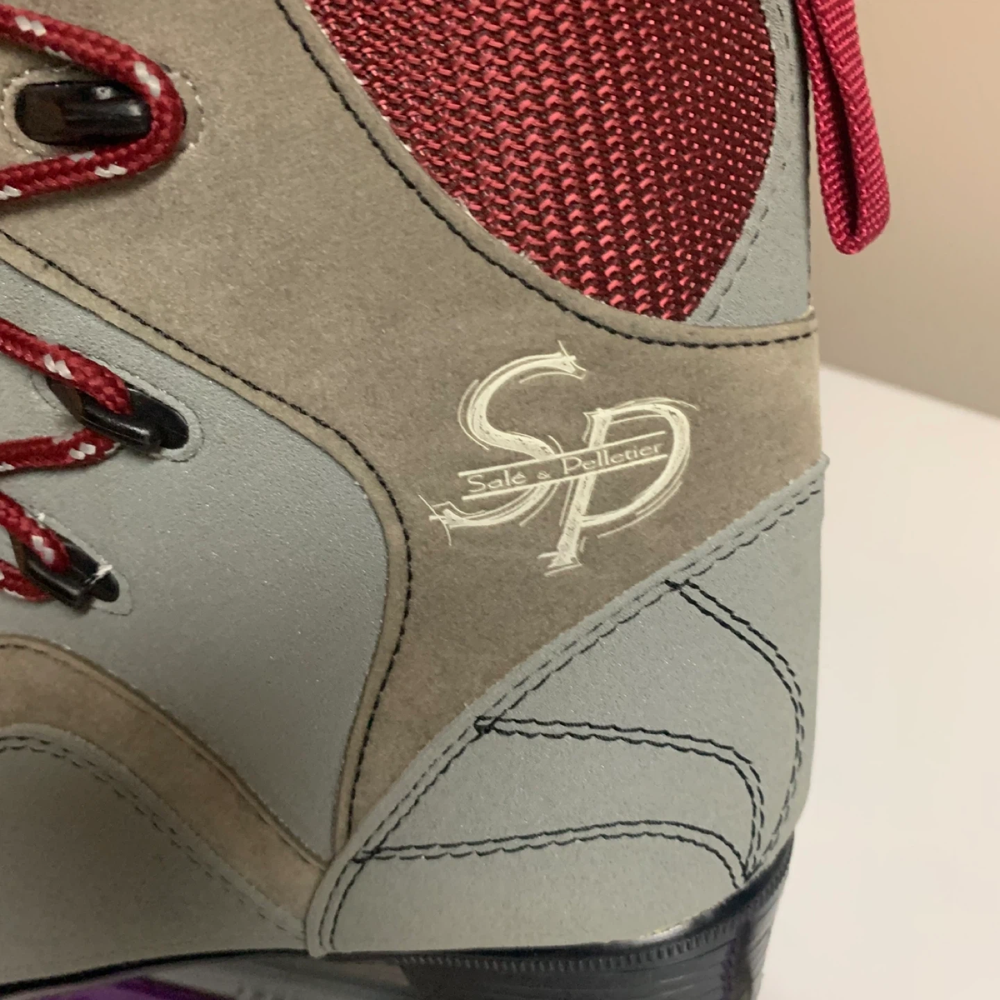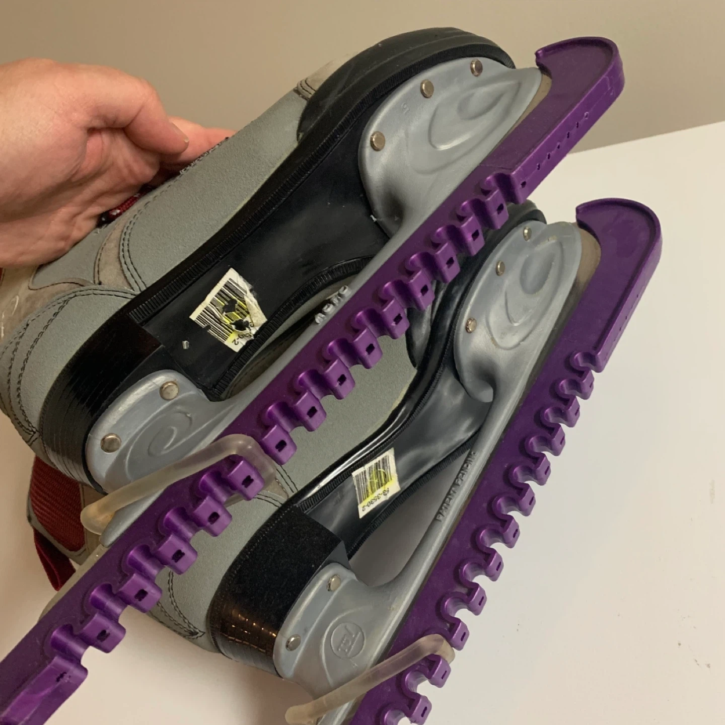 CCM 100 figure skates. Suede and synthetic material construction. Red laces with grey and burgundy accents. Comes with purple blade guards. Excellent condition!