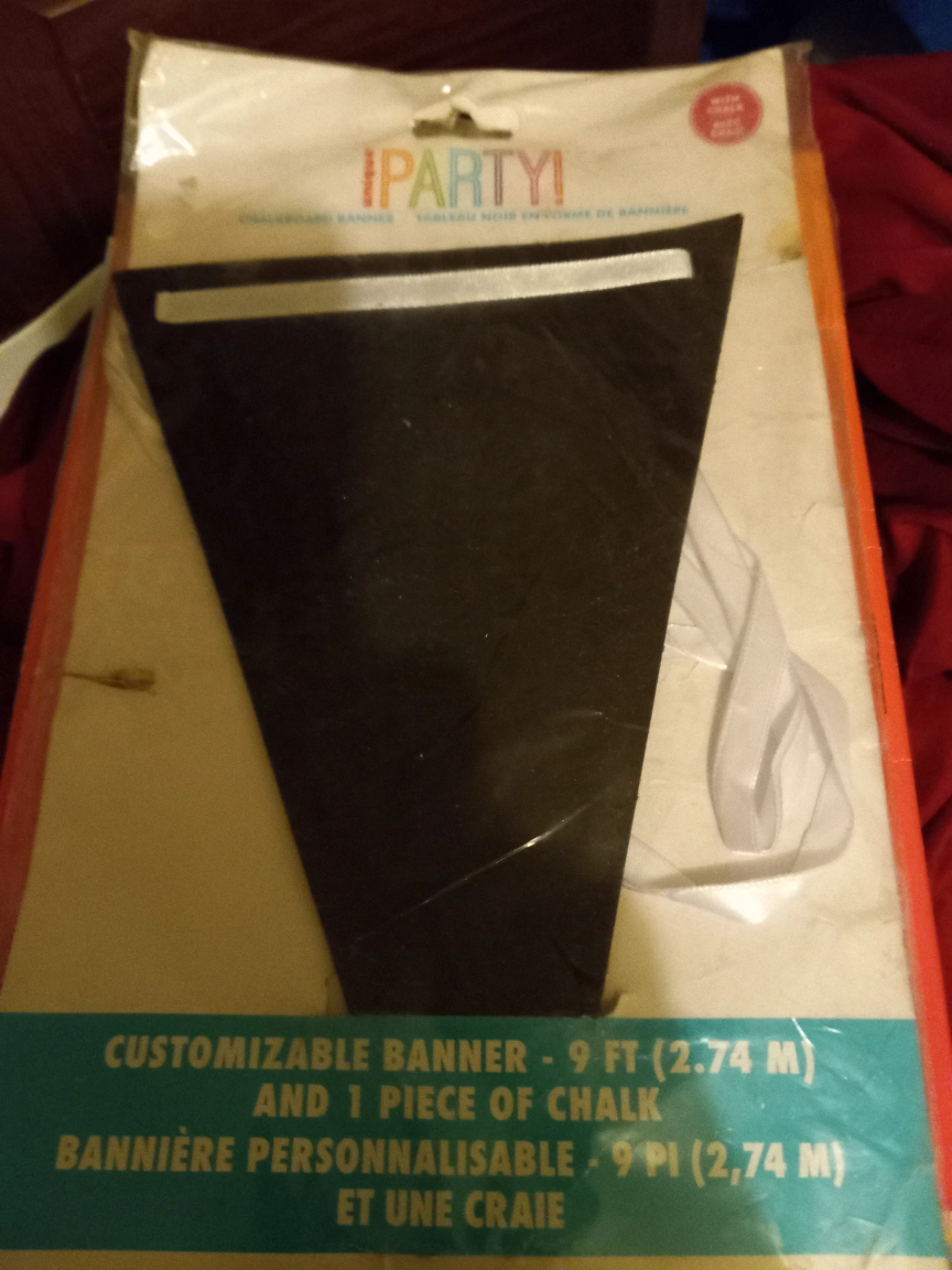 This is a customizable chalkboard banner from iParty!. It's 9 ft (2.74 M) long and includes no piece of chalk. It's perfect for parties or decorating! but you can use your own