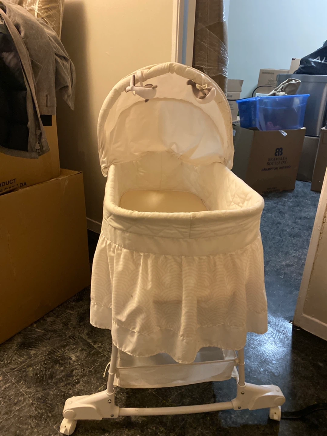 This bassinet is white with a quilted interior and a ruffled skirt. It features a cute embroidered whale on the front. The canopy is adjustable. Perfect for newborns!