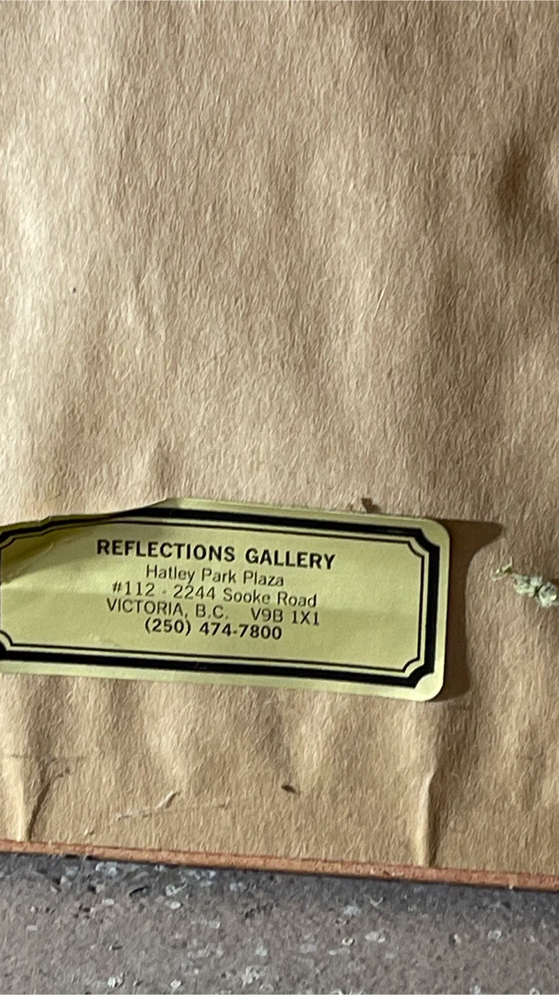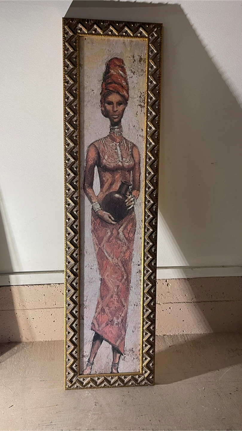 Framed art from Reflections Gallery in Victoria, BC. The frame is gold and the art depicts a woman holding a vase.