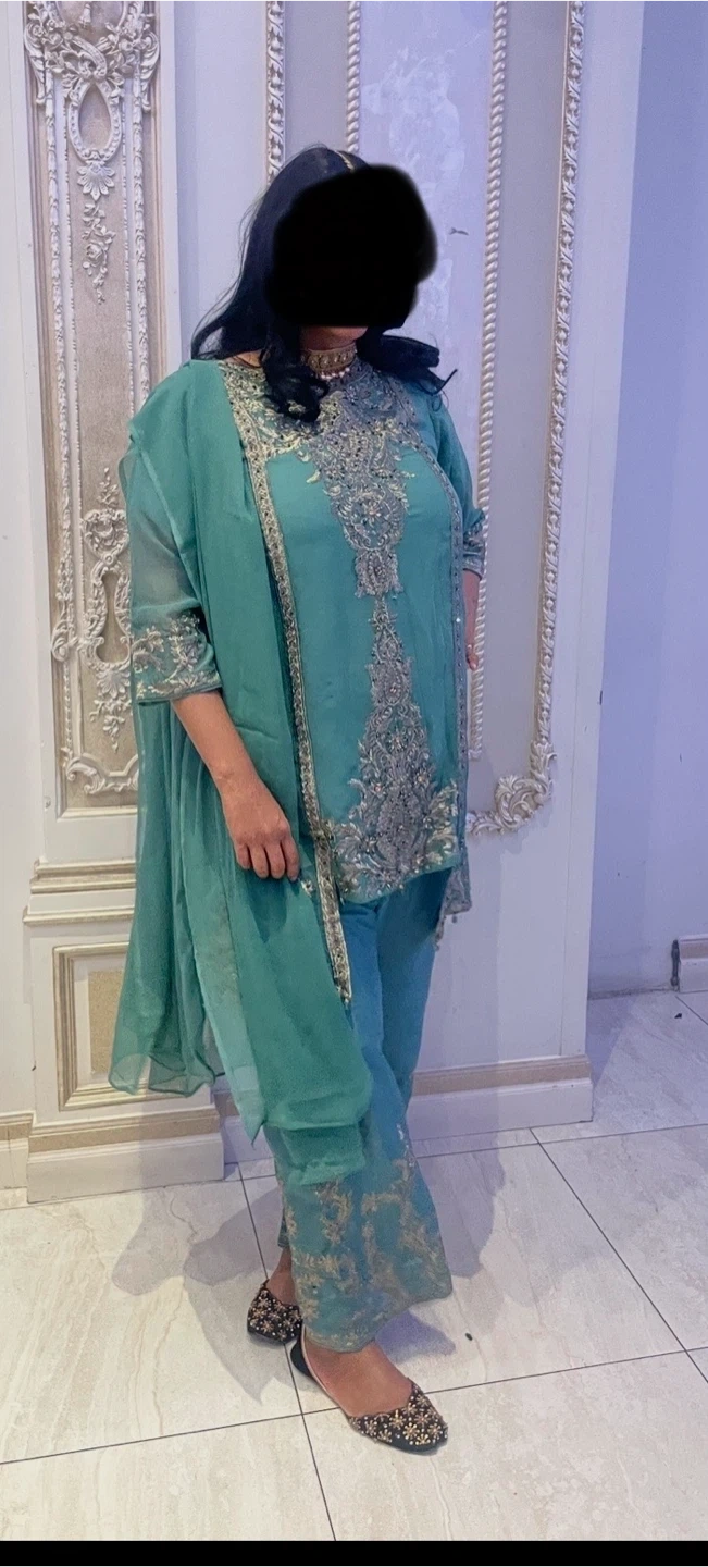 This is a women's three-piece outfit. It includes a teal kameez with intricate silver embroidery on the neckline and sleeves. A matching dupatta and trousers are also included. The material appears to be lightweight and flowy.
