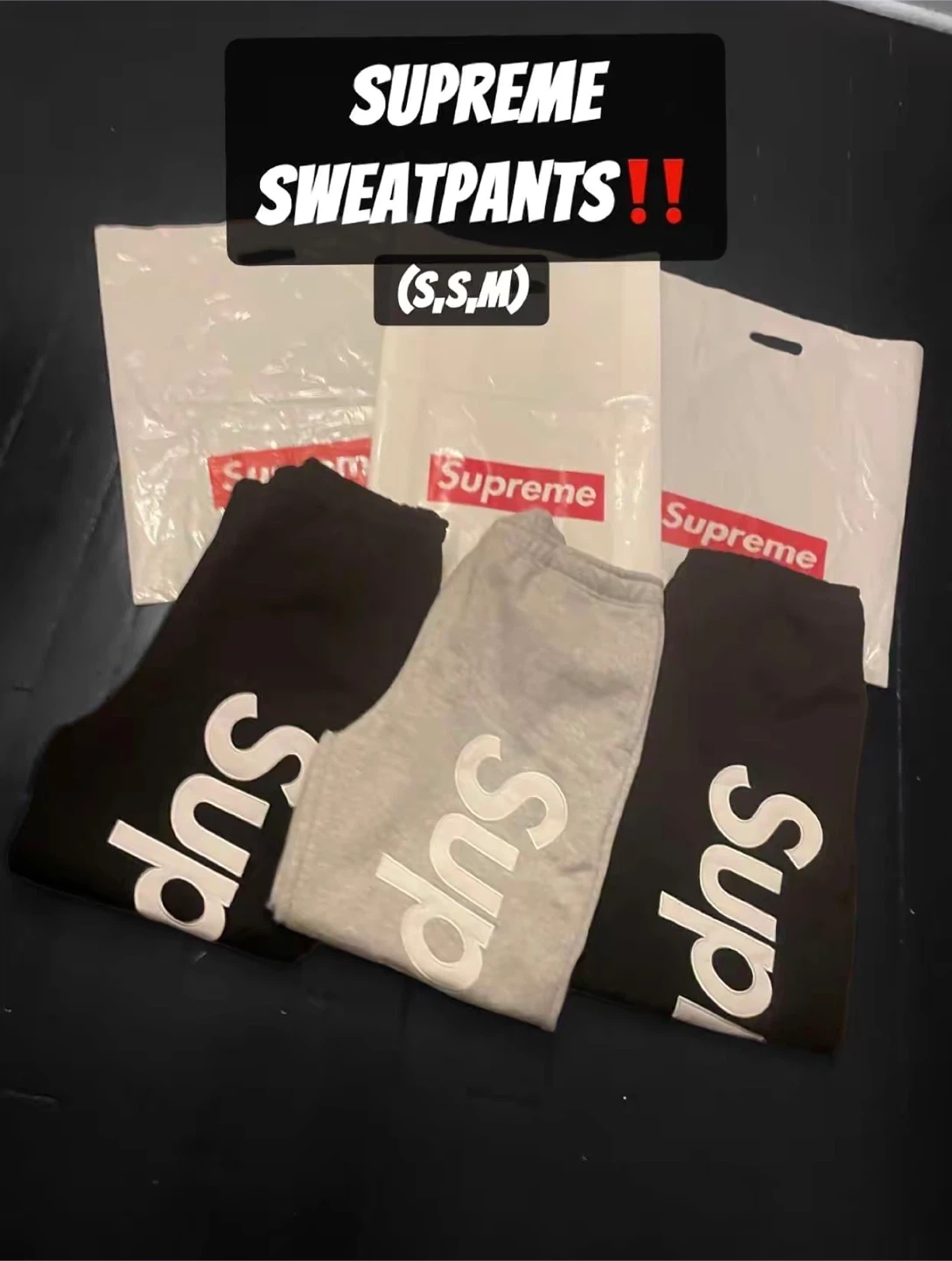 Three Supreme sweatpants available in black and grey. Sizes S and M. They feature the iconic Supreme logo printed vertically on the side. Made for comfort and style, these pants are perfect for casual wear. Get yours today!