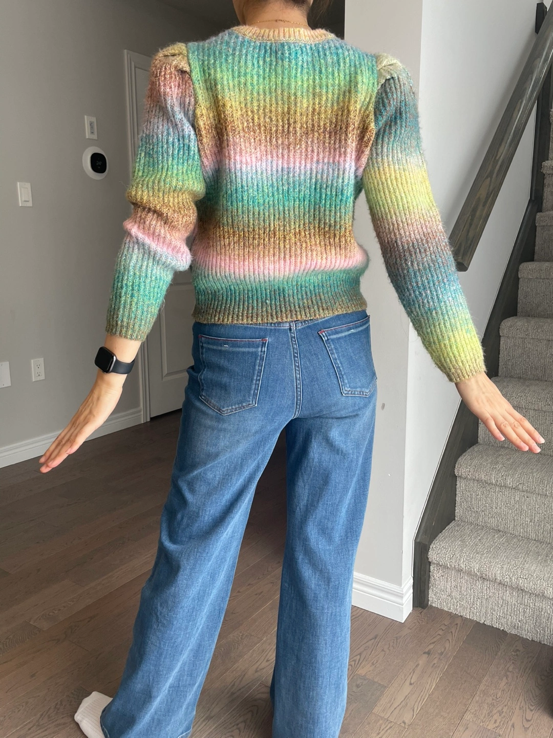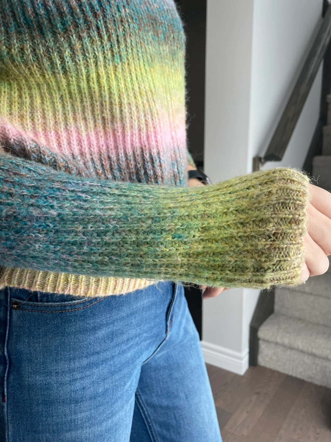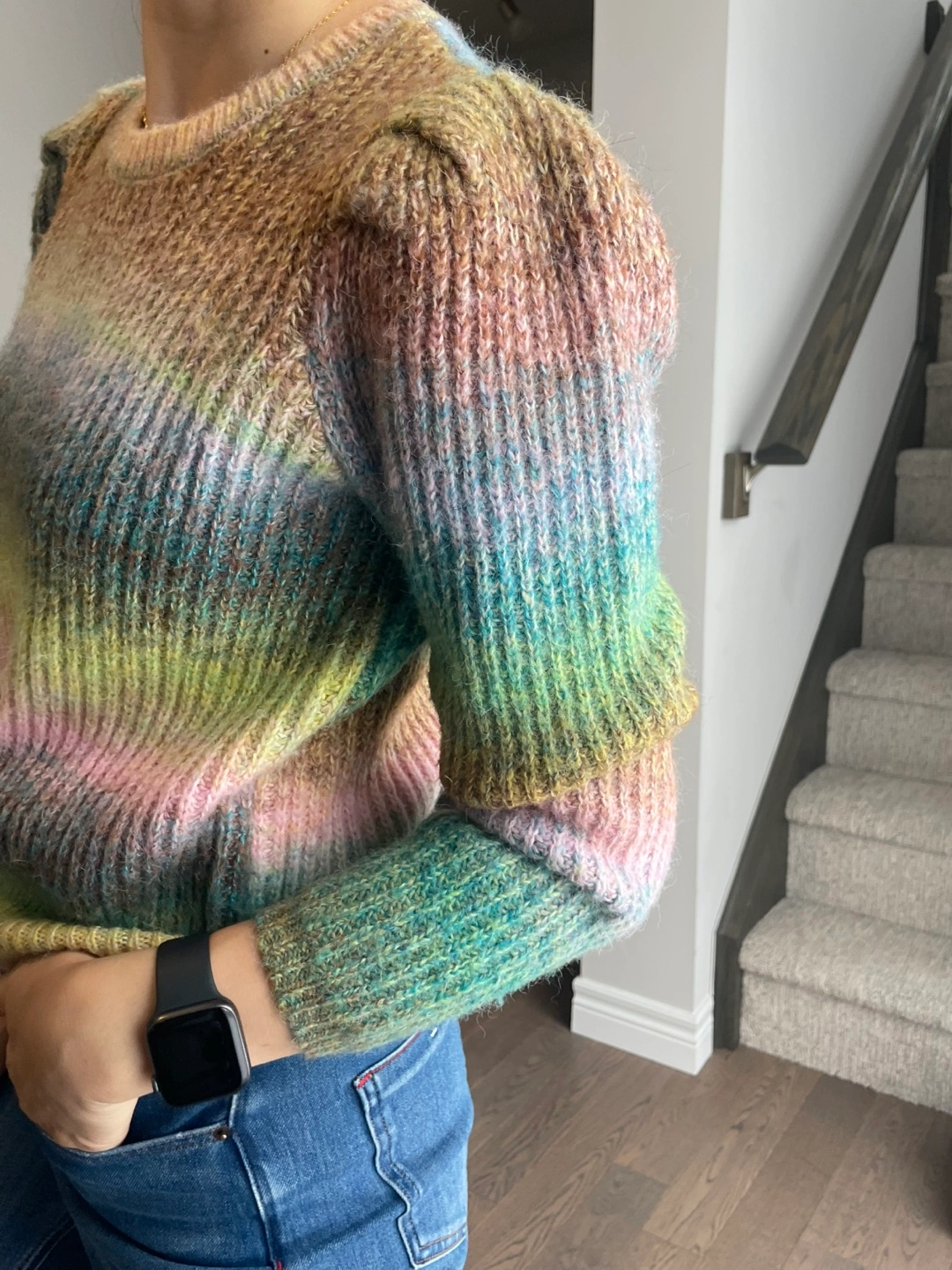 Cozy rainbow striped sweater with a comfortable fit. It features stylish puff sleeves and a ribbed knit texture. This sweater's yarn blend gives it a soft feel and a lovely variegated colour effect.