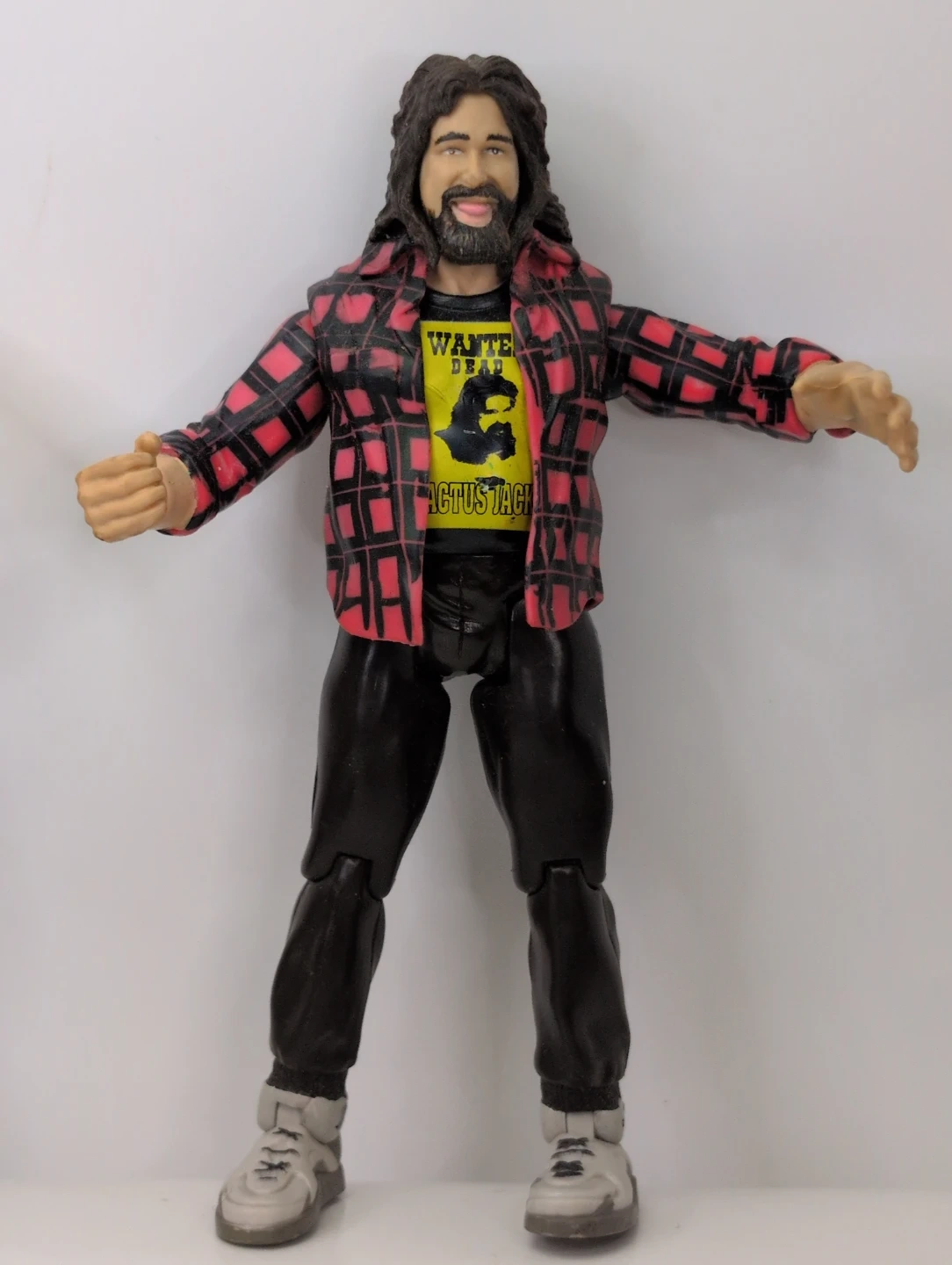 Two wrestling action figures included. One figure has a bald head and a brown outfit, while the other has long hair and wears a red and black plaid shirt over a yellow t-shirt. They're ready for the ring!
