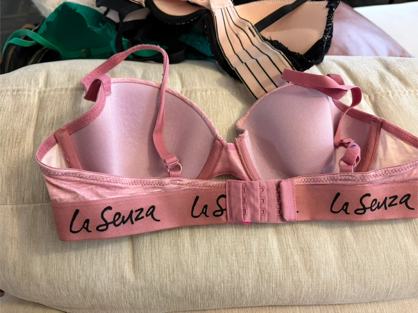 This is a padded bra from La Senza. It's a light pink heathered fabric with a comfortable band. The bra features adjustable straps and a standard hook-and-eye closure. It's designed for everyday wear.