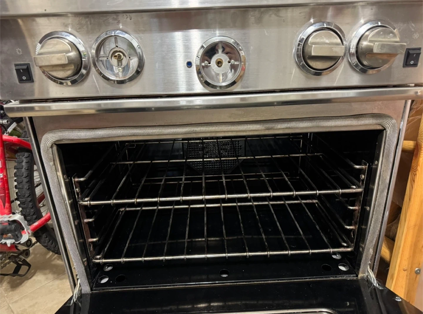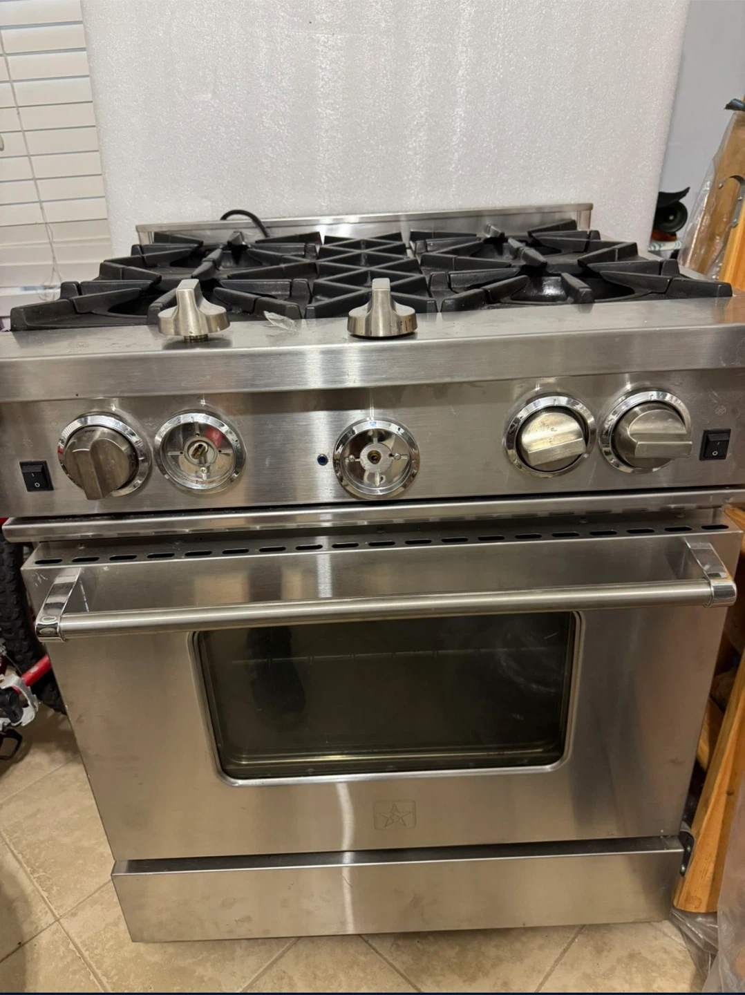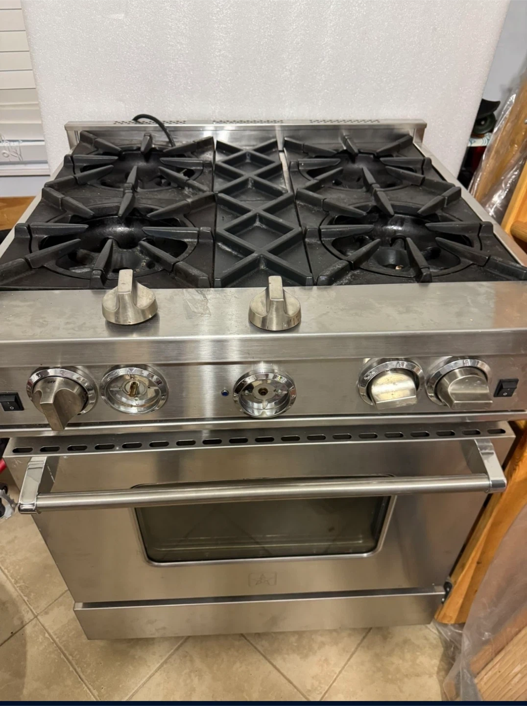 Professional-grade BlueStar range, natural gas, stainless steel finish. Center oven control shaft needs to be replaced (stem for the knob broke) Perfect for anyone who loves to cook.