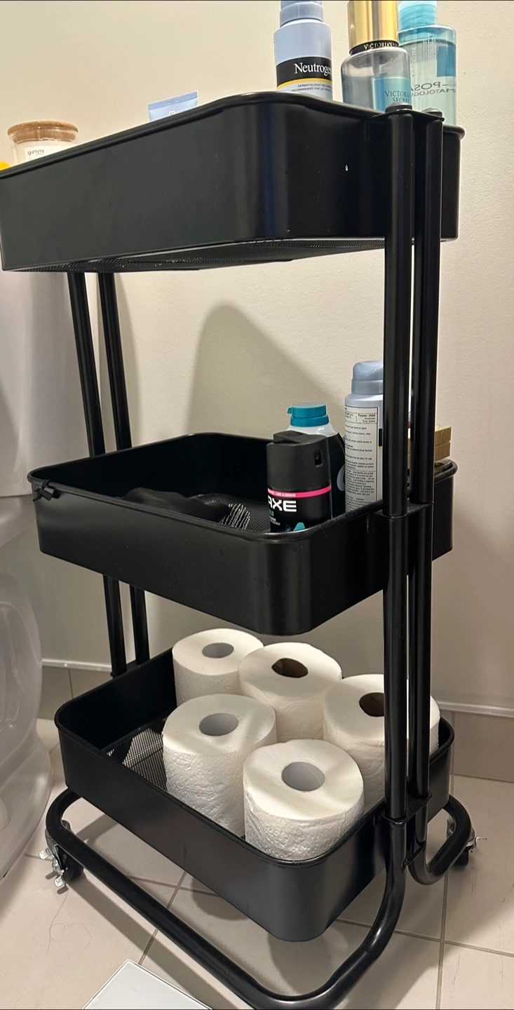 Selling a handy black 3-tier rolling cart! It's perfect for adding extra storage in your kitchen, bathroom, or craft room. The mesh shelves are great for ventilation and keeping things organized. Easy to move around thanks to the smooth-rolling casters