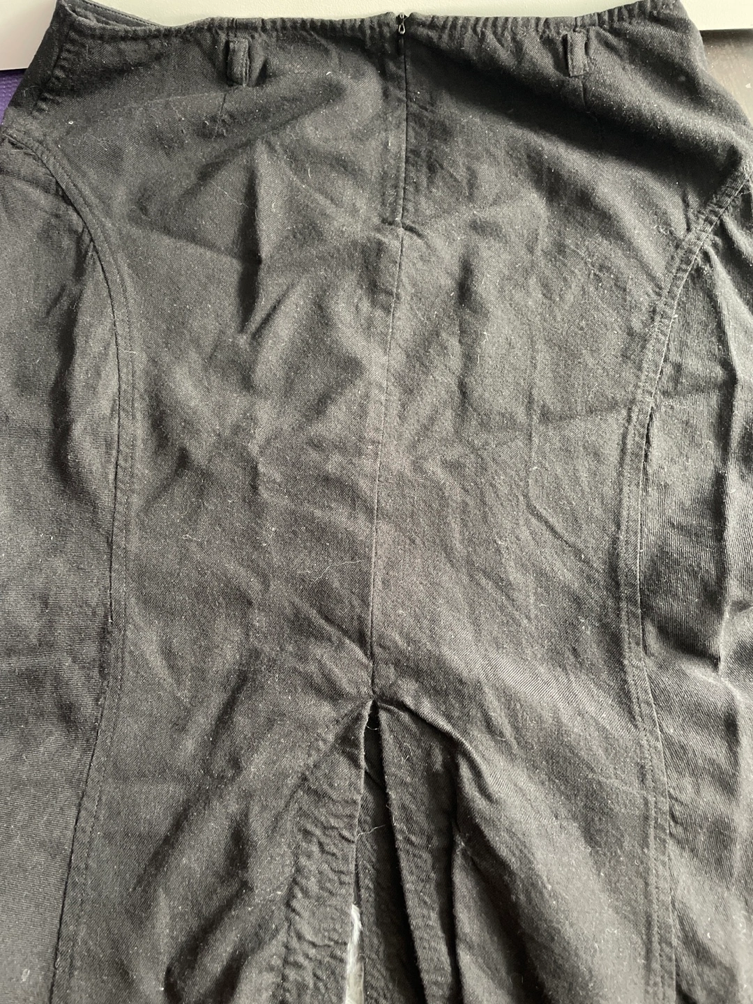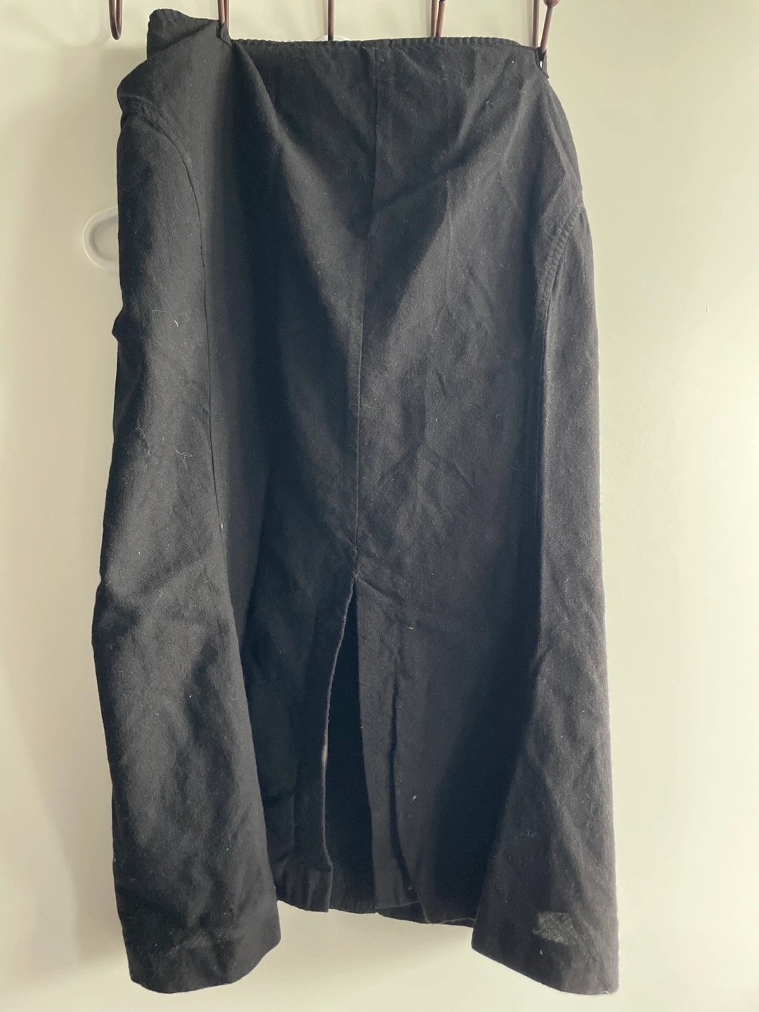 607Classic black A-line skirt. Features a back zipper and a center back vent. Mid-length. Good for work or casual wear.