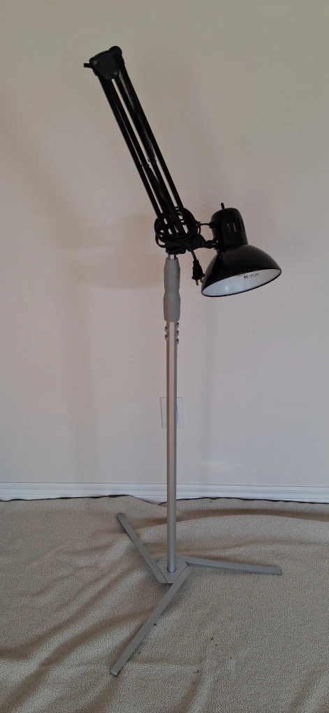 56Here's a cool adjustable architect-style desk lamp! It's black on the outside, with a white interior shade. The lamp has a sturdy base and an adjustable arm, perfect for a home office or study space