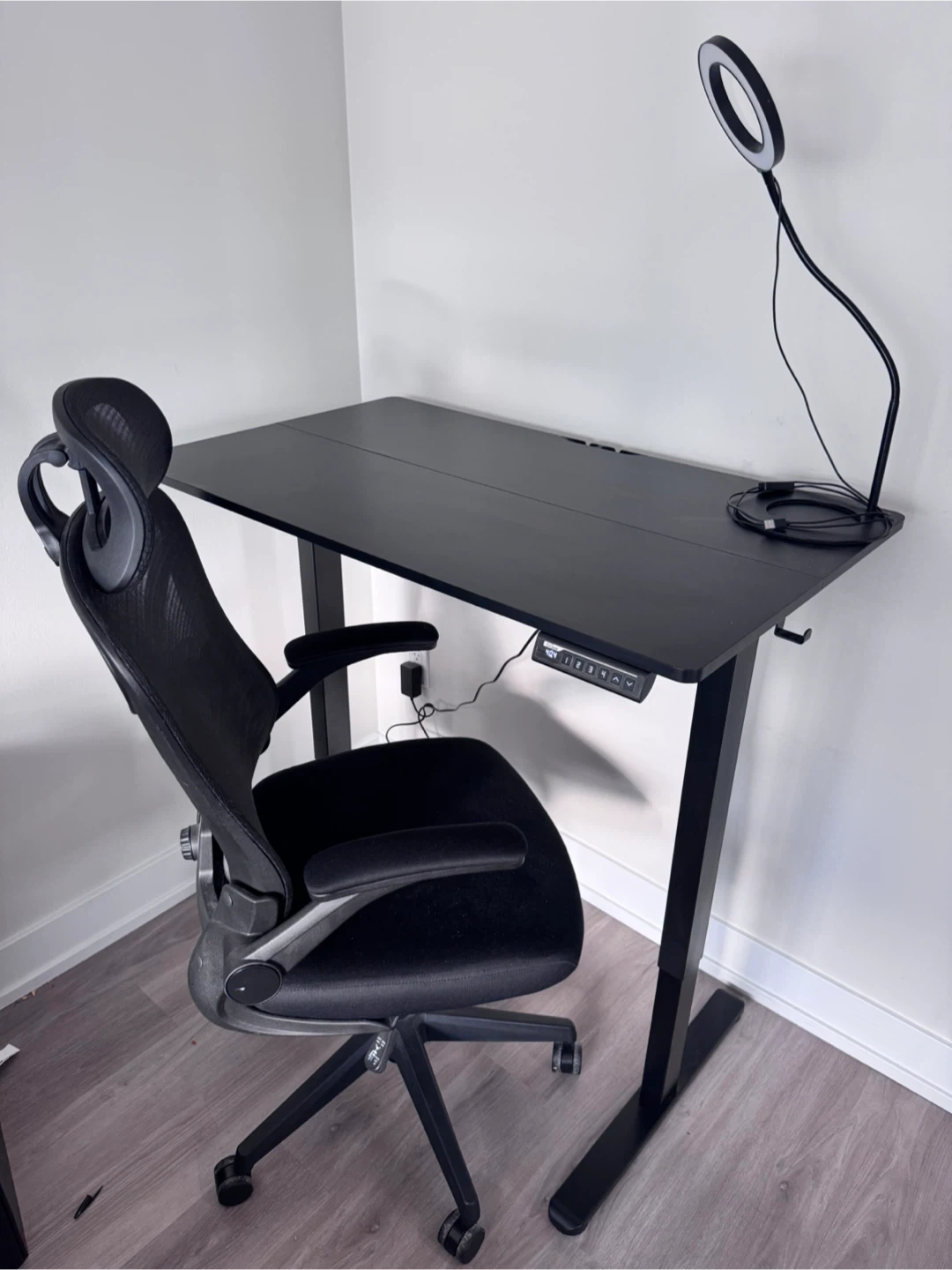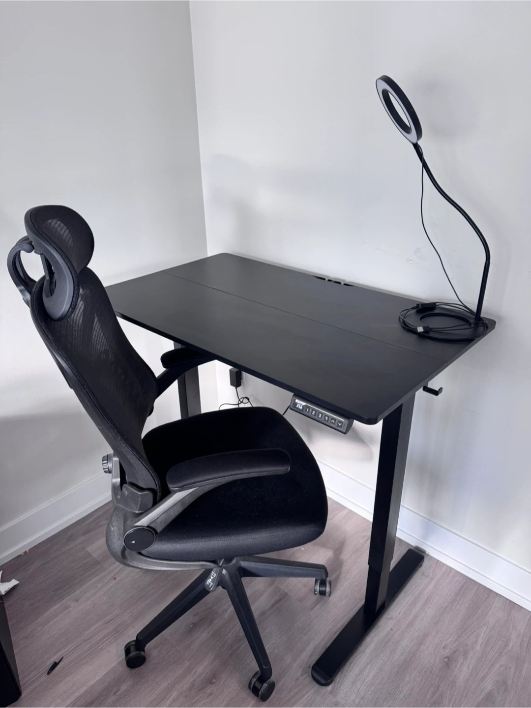 60Selling a black adjustable standing desk and office chair. Both are in great condition and would be perfect for a home office setup. The desk is height adjustable, and the chair is very comfortable for long hours of work or study. The desk also comes with a ring light!