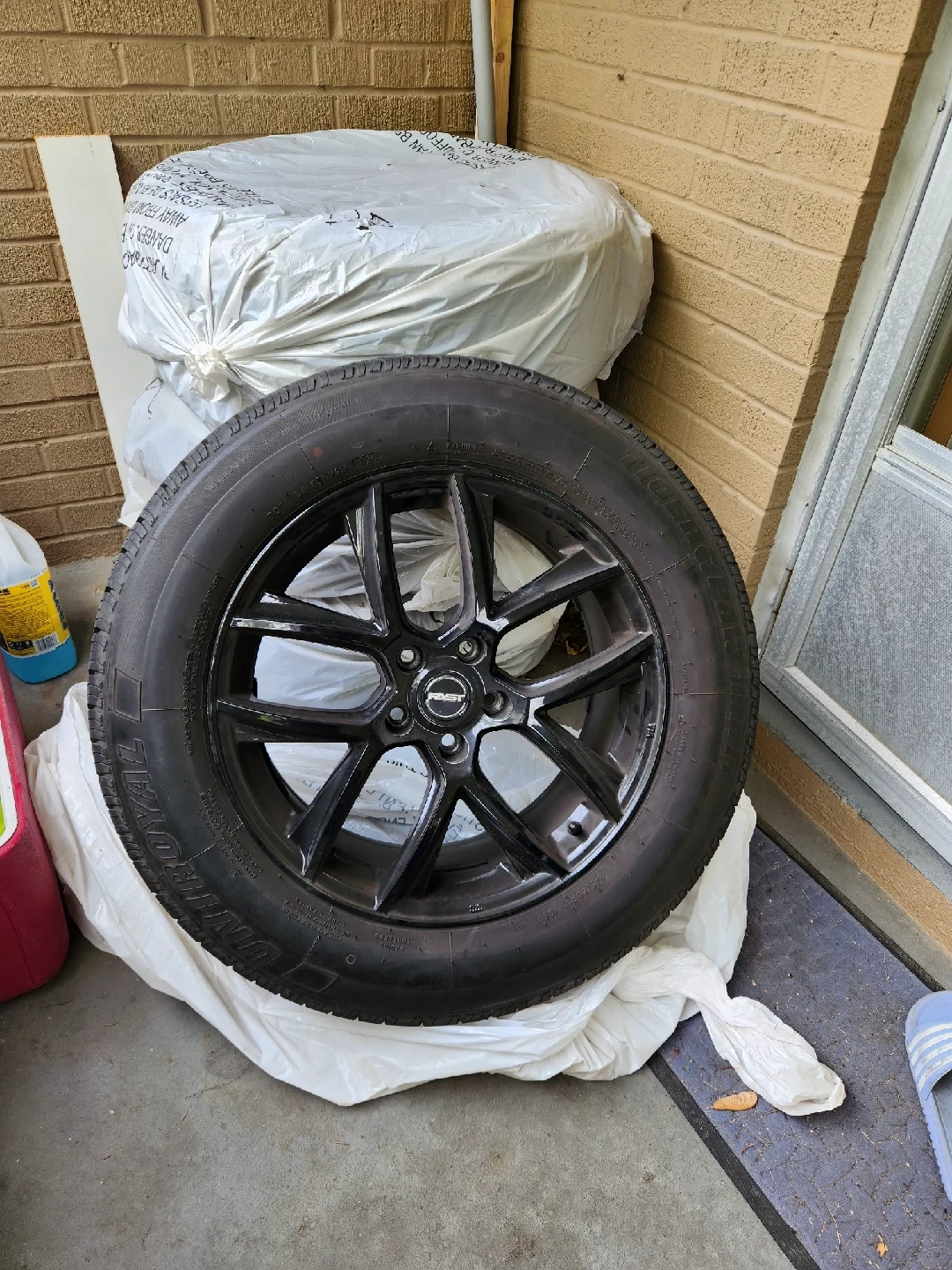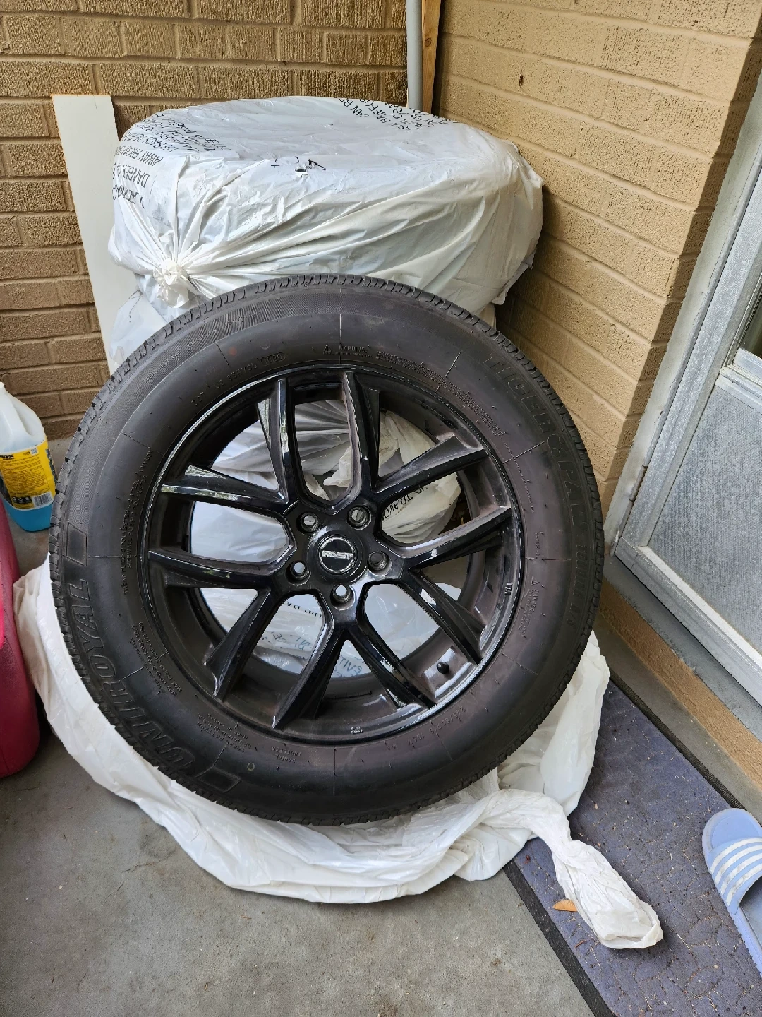 60Selling a used black alloy wheel with a tire. The tire has visible tread, as shown in the pictures. 4 (pcs) 245/60R18 Tiger Paw Touring with Stephanie Fast Wheels 5X114.3 TPMS Sensor All Season Just used for 2 season Not fit for my new car anymore