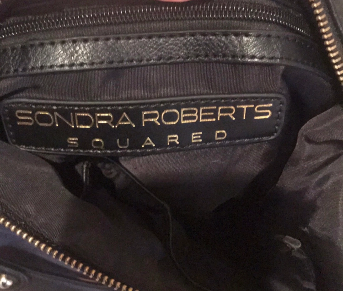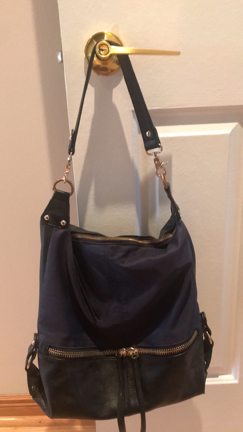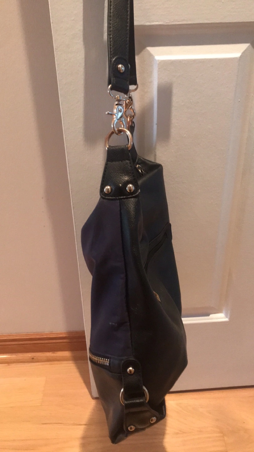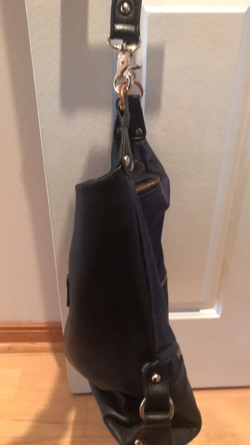 A stylish Sondra Roberts Squared black and blue leather shoulder bag that's perfect for everyday use! It features a zipper and strap for a comfortable fit. The bag has a sleek design and is in great condition. Pick up location is 10 Alcorn Avenue Toronto M4V1E4