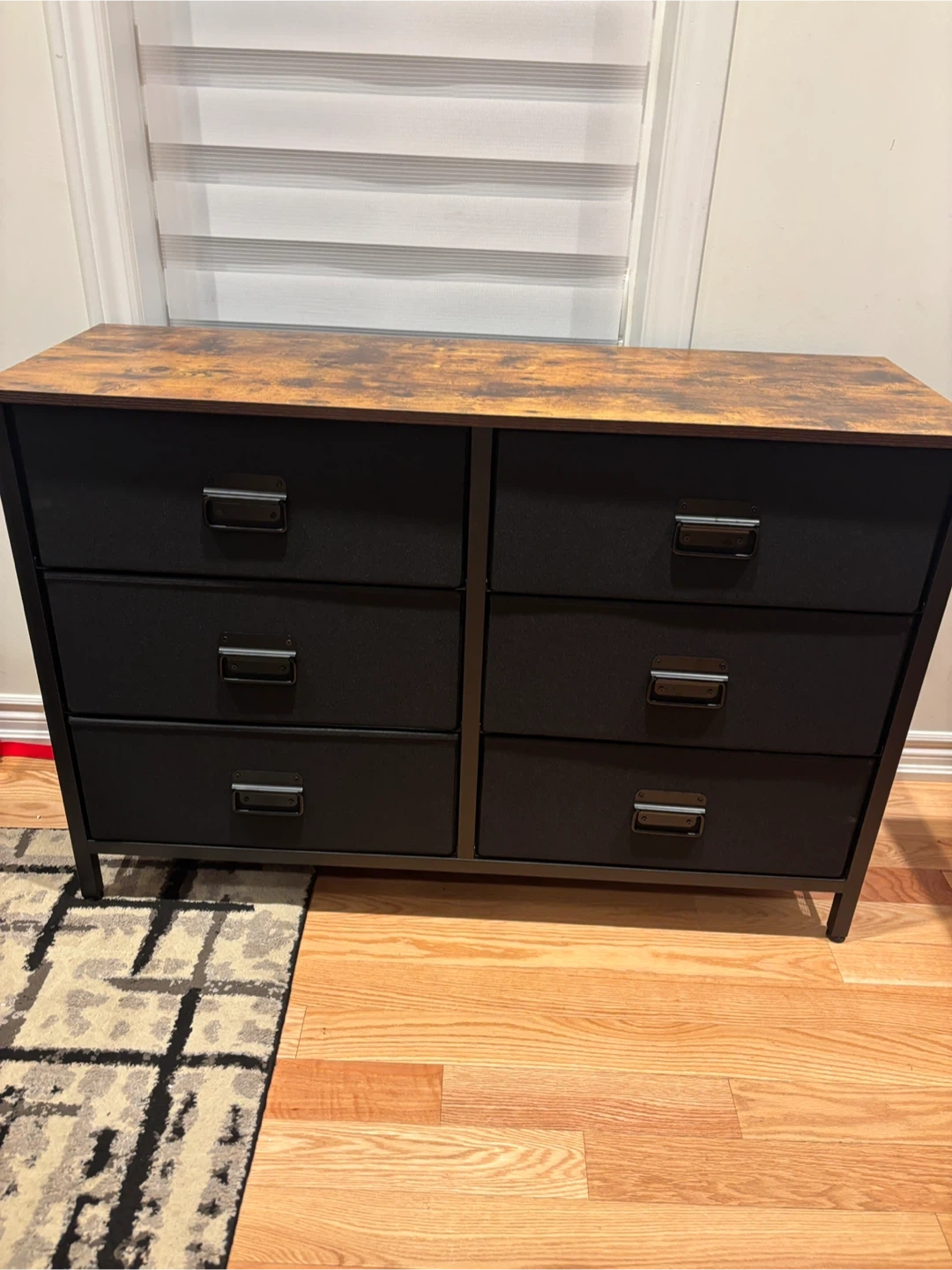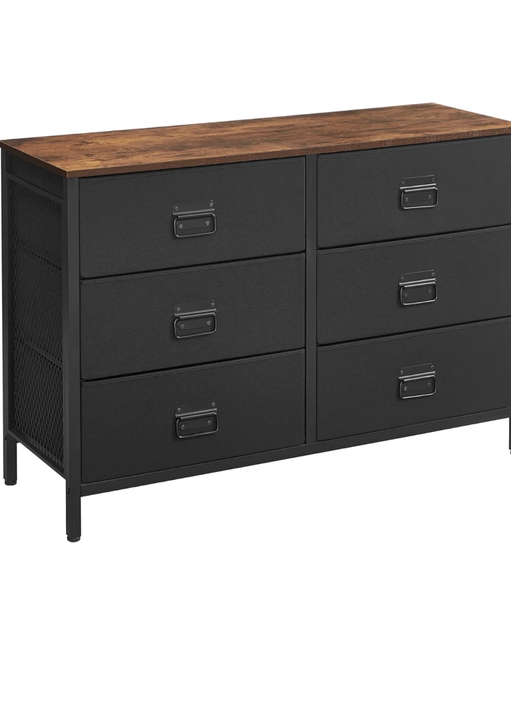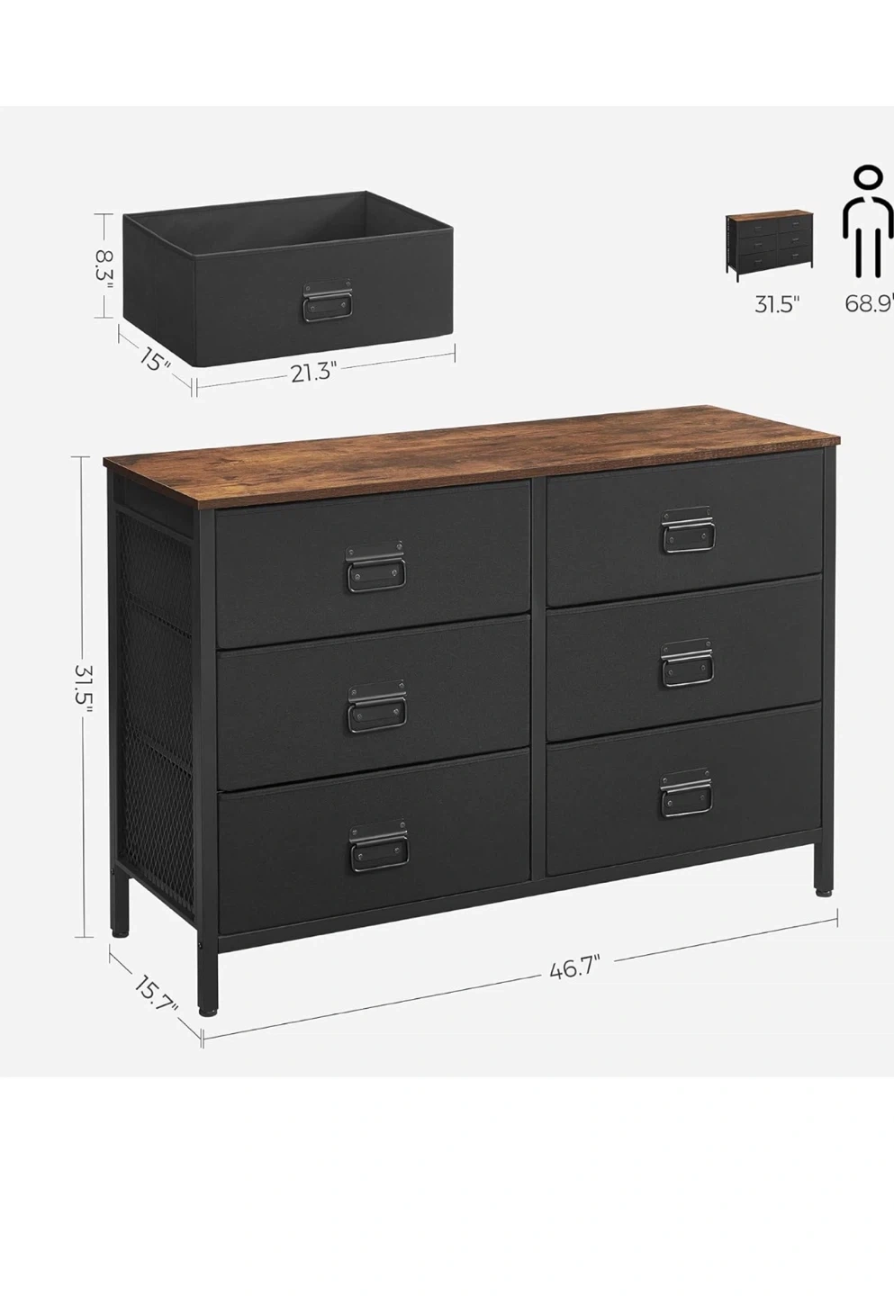 202Selling a SONGMICS 6-drawer dresser! It features a black frame with a brown wood-look top. The dimensions are approximately 46.7" wide, 31.5" tall, and 15.7" deep. Each drawer is about 8.3" tall, 21.3" wide, and 15" deep. Great for adding some extra storage to your space! It is a cloth Drawer. Can also be used in an Entryway