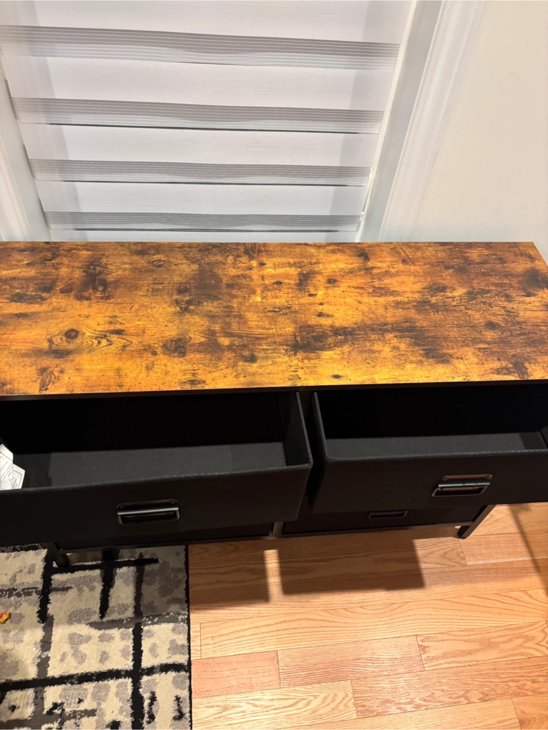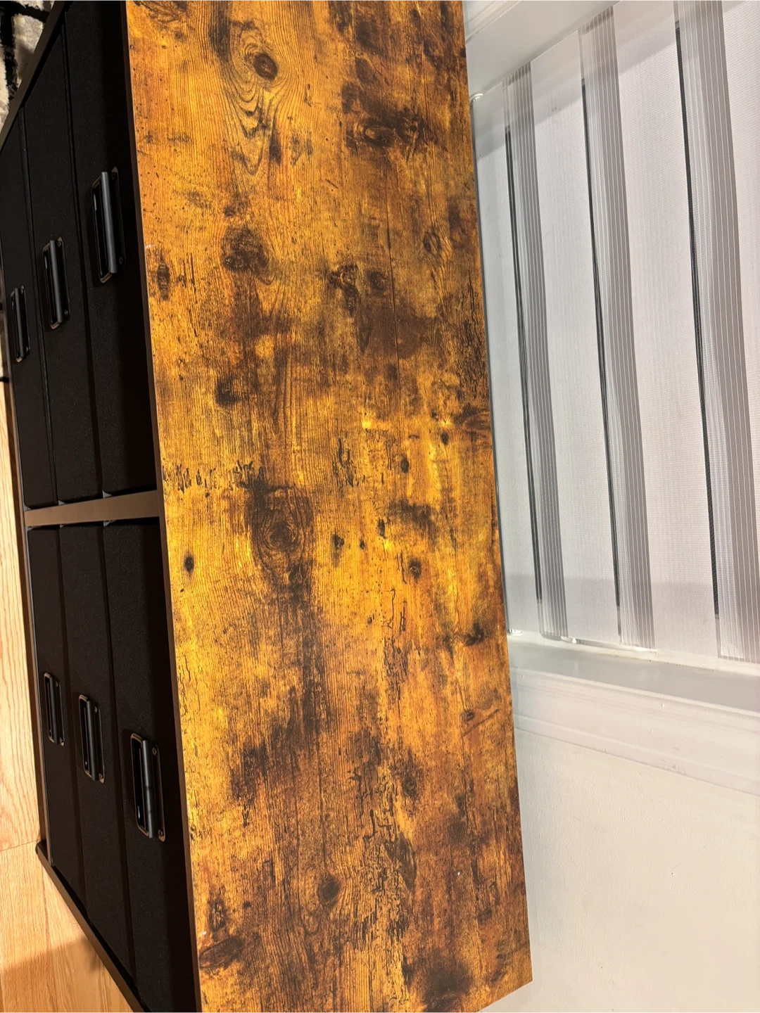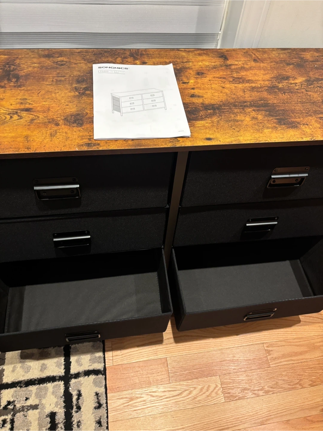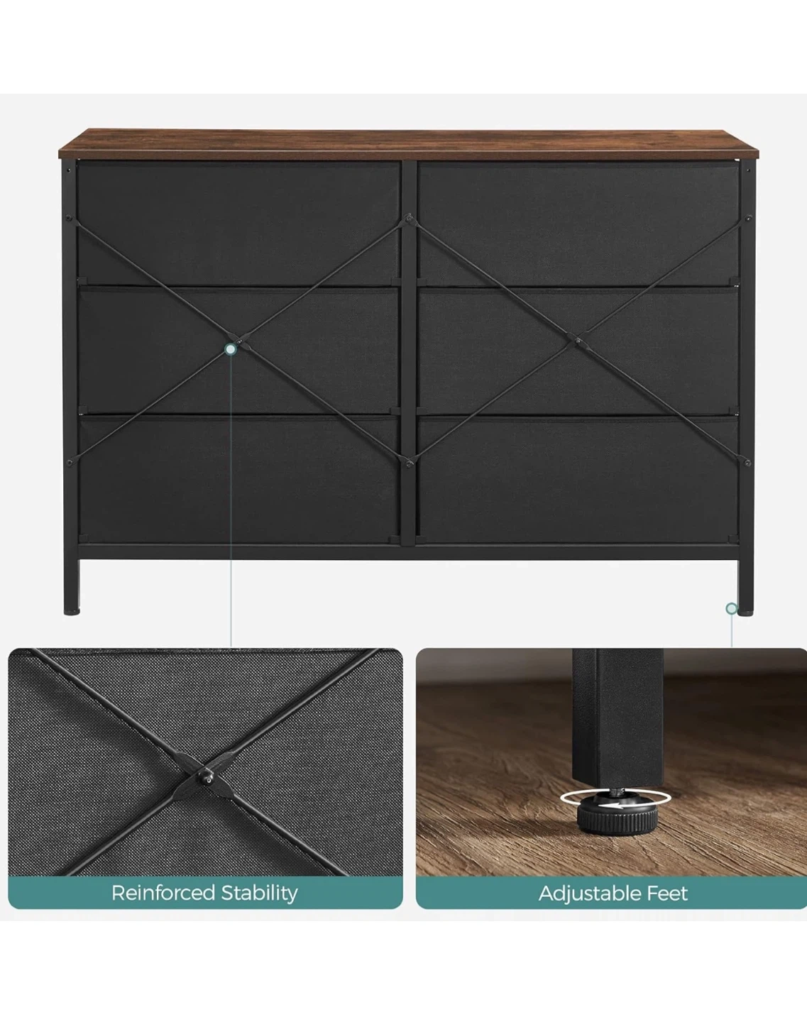202Selling a SONGMICS 6-drawer dresser! It features a black frame with a brown wood-look top. The dimensions are approximately 46.7" wide, 31.5" tall, and 15.7" deep. Each drawer is about 8.3" tall, 21.3" wide, and 15" deep. Great for adding some extra storage to your space! It is a cloth Drawer. Can also be used in an Entryway