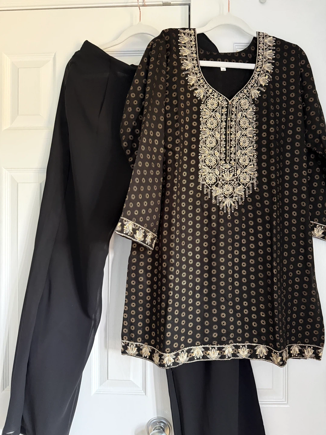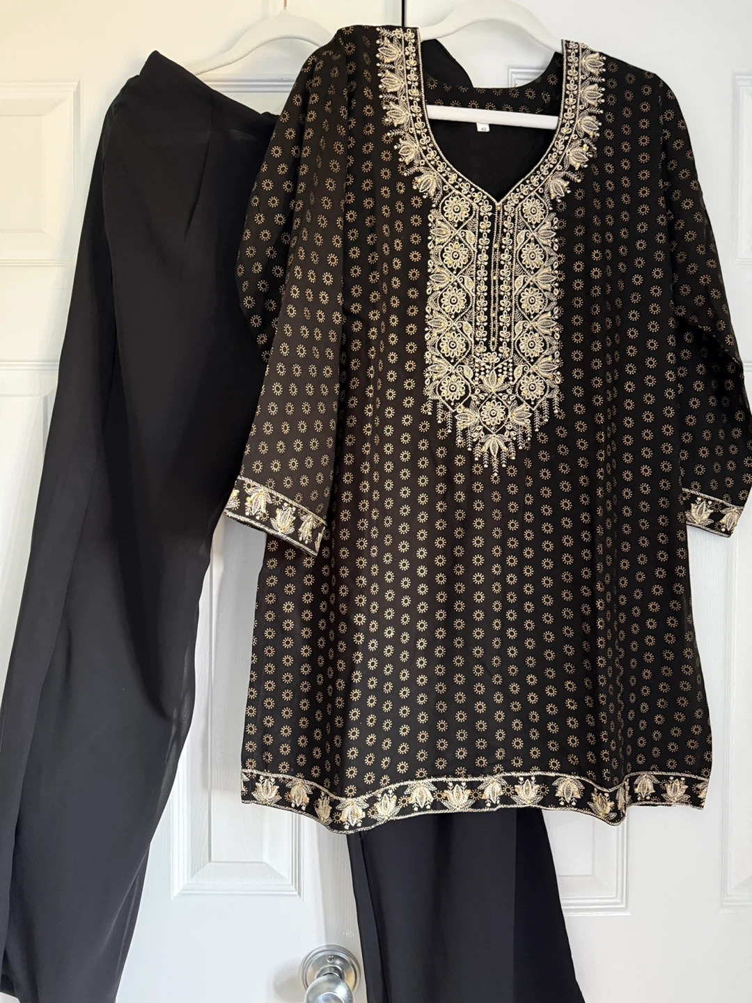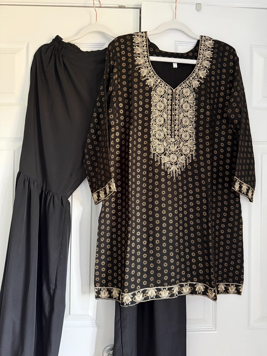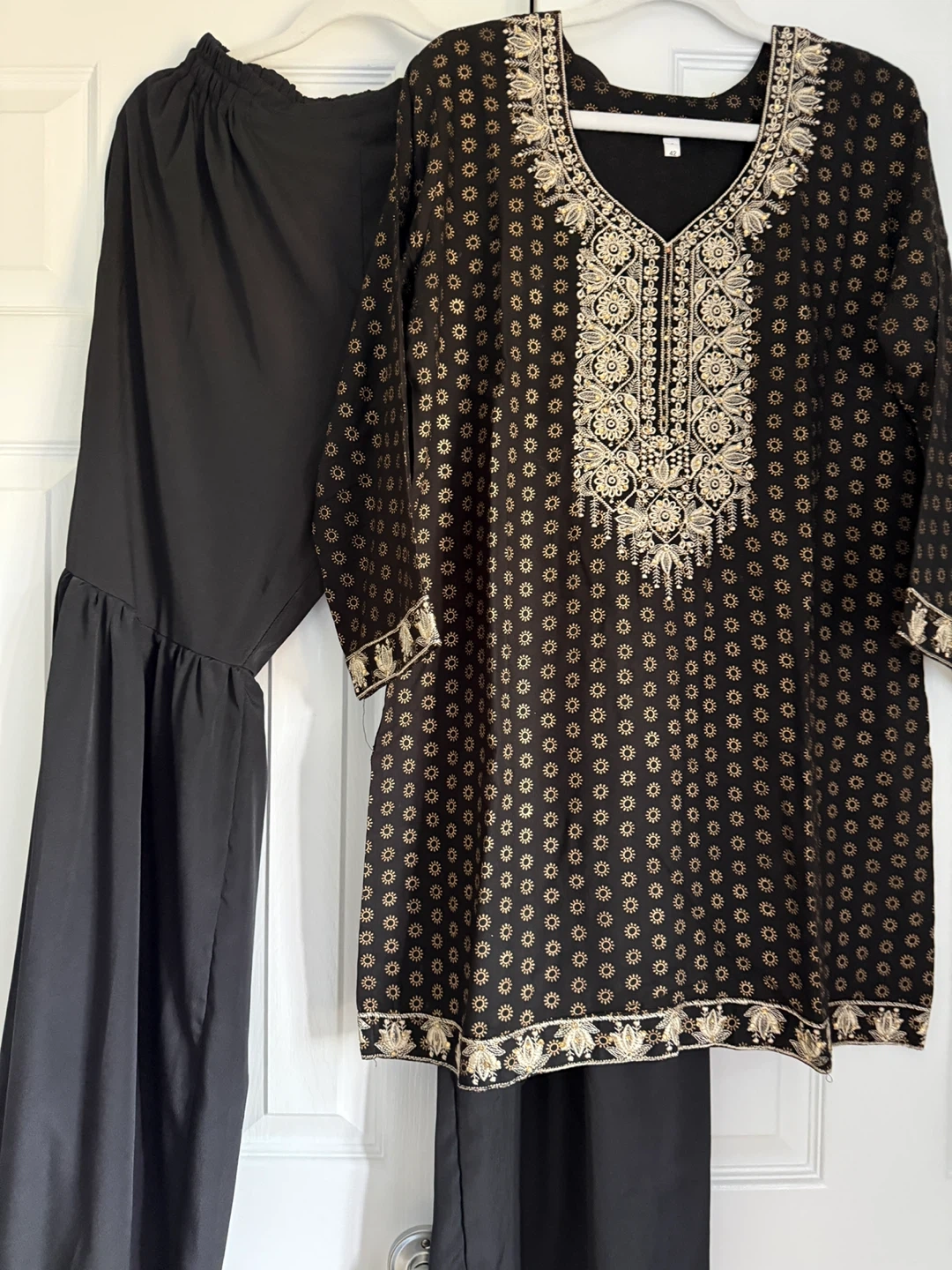 Selling a beautiful salwar kameez set in black with gold embroidery. This outfit is perfect for special occasions or cultural events. The fabric feels lovely and comfortable, and the embroidery adds a touch of elegance. It's in great condition and ready for a new home!