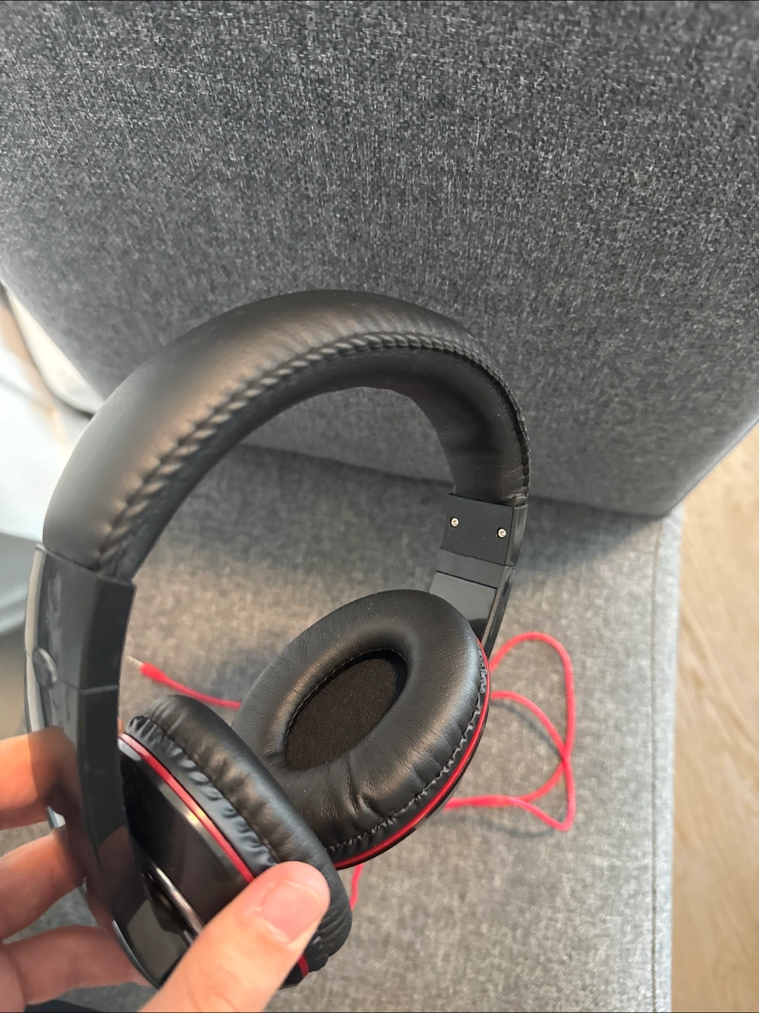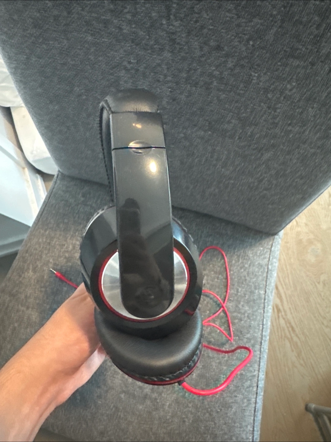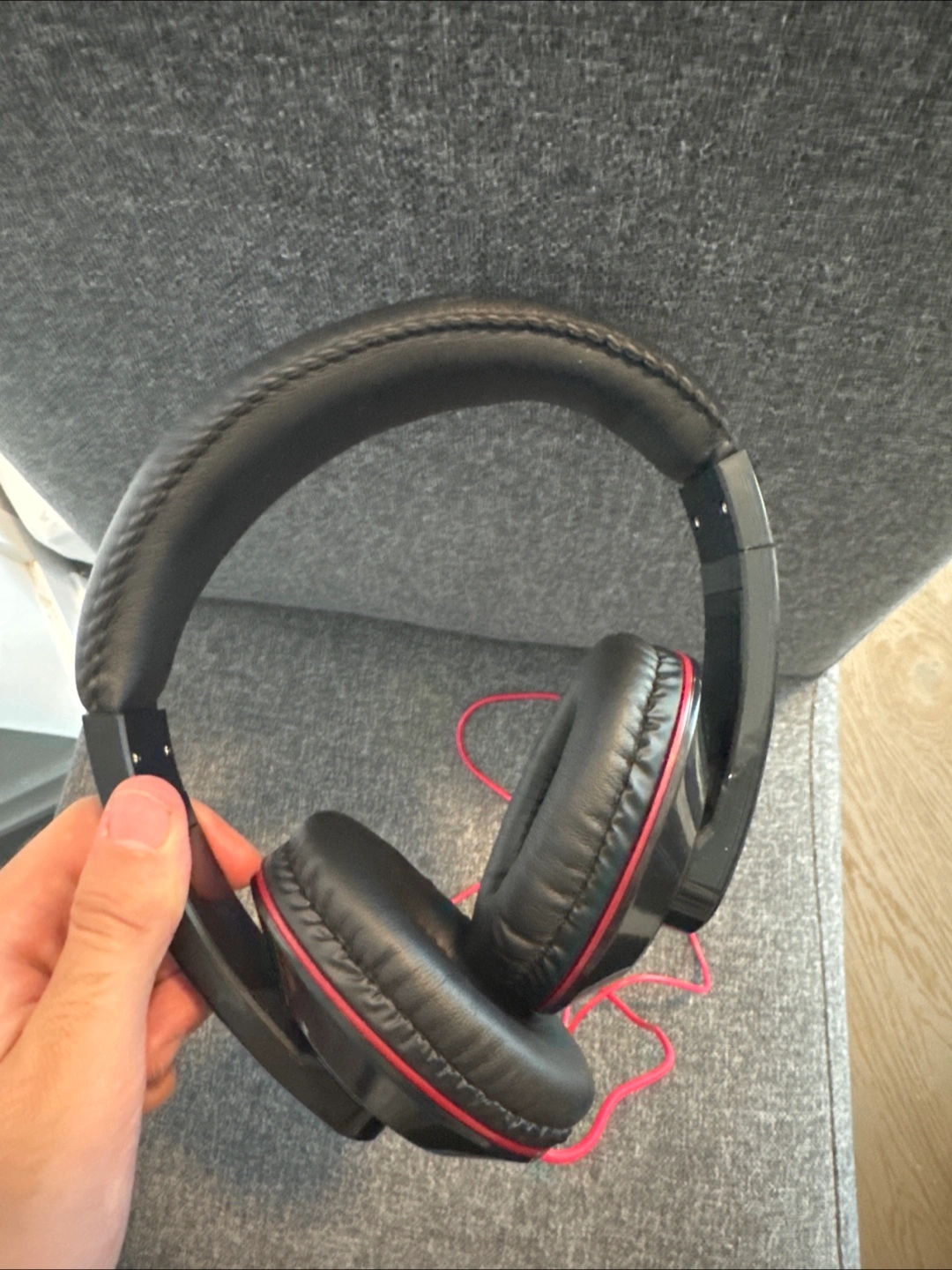 Selling a pair of wired headphones in black with red accents. They're in good condition and ready for a new home! Perfect for listening to music or podcasts.