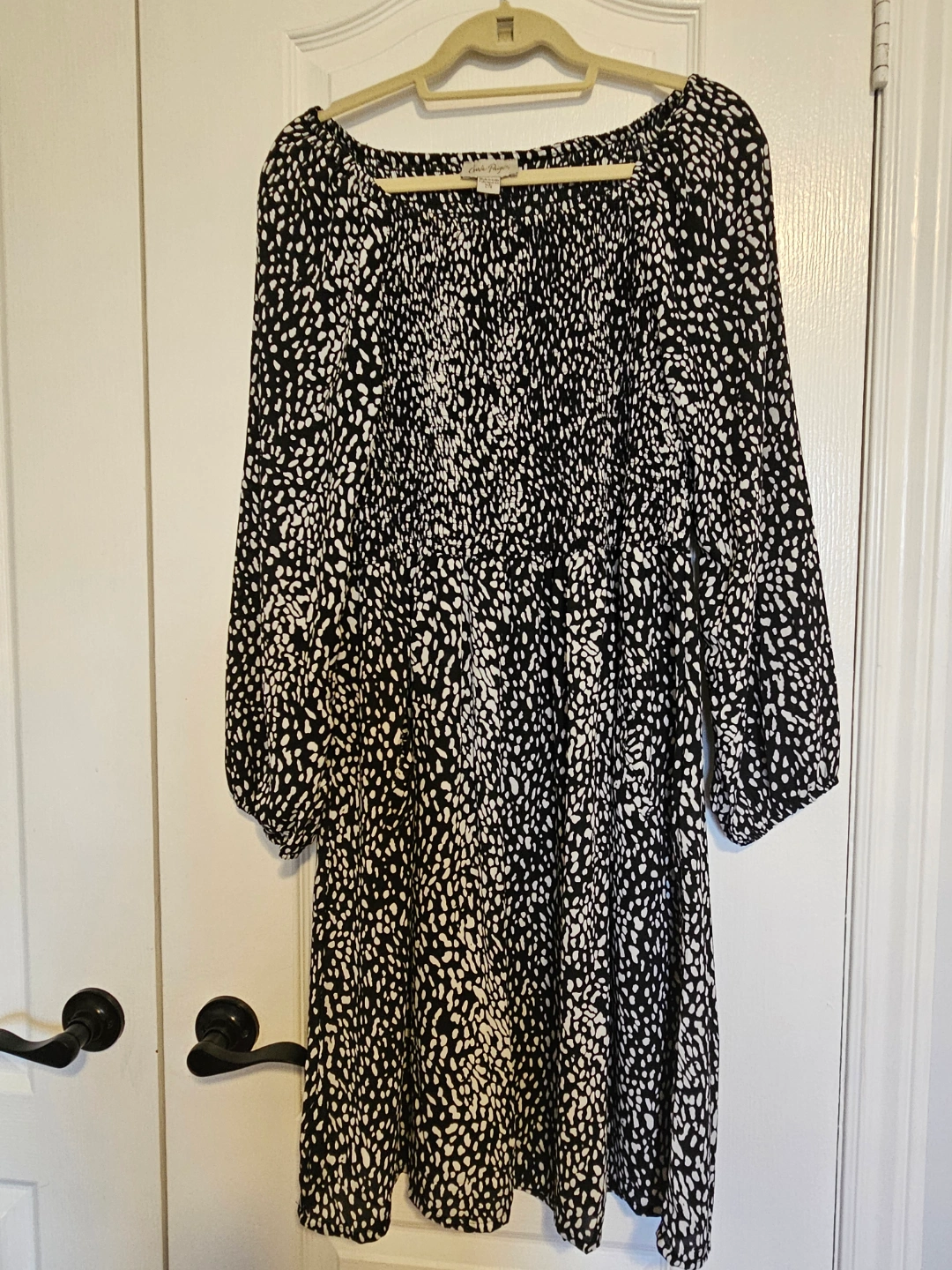 18Adorable mini dress. Features a smocked bodice, three-quarter sleeves, and an off-the-shoulder neckline. Dalmatian print. Lightweight fabric.