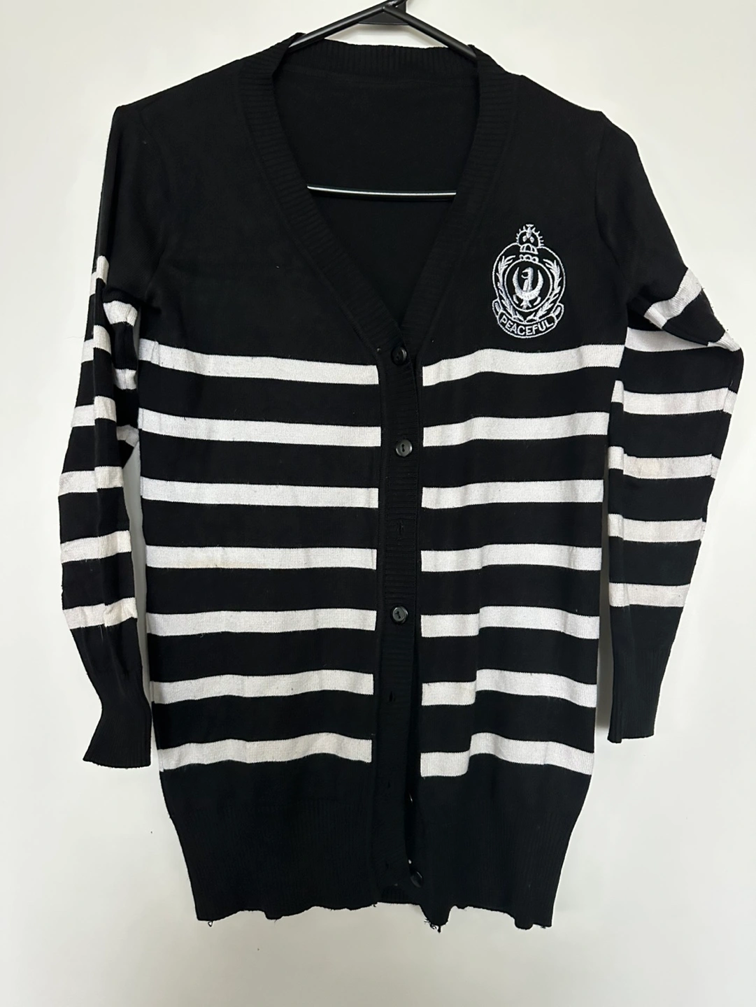 147Barely worn smart black and white striped cardigan sweater. Features a button closure and embroidered logo. Long sleeves. Great for layering.