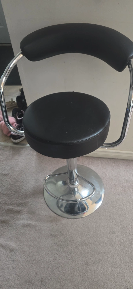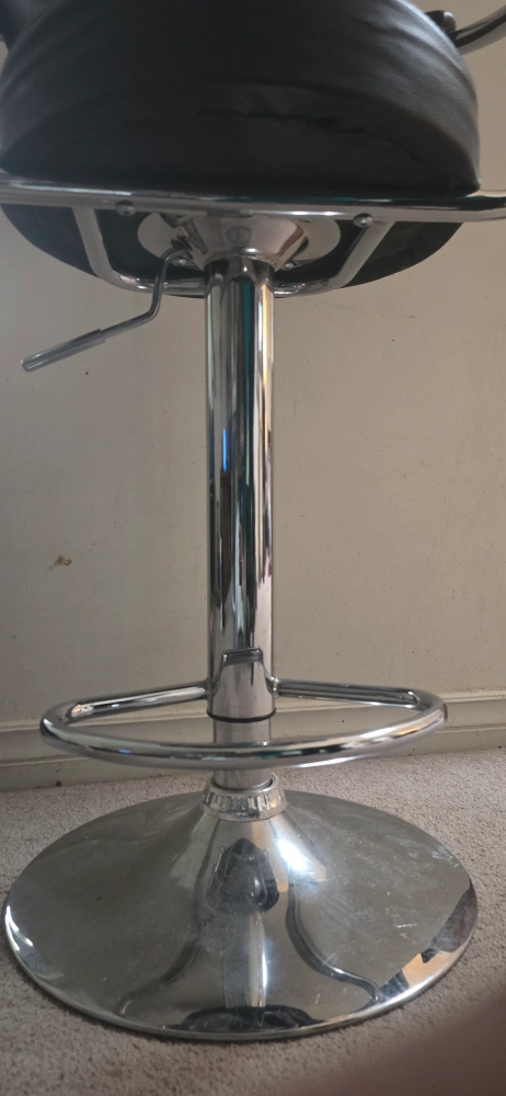 Here's a comfy black bar stool with a shiny chrome base! It's perfect for adding a bit of style to your kitchen or bar area. The seat is padded for extra comfort, and the height is adjustable.