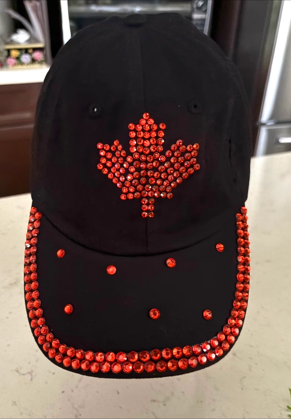 60Selling a black baseball cap featuring a glittering red crystal maple leaf design. It's in great condition and would be a perfect accessory for showing off your Canadian pride!