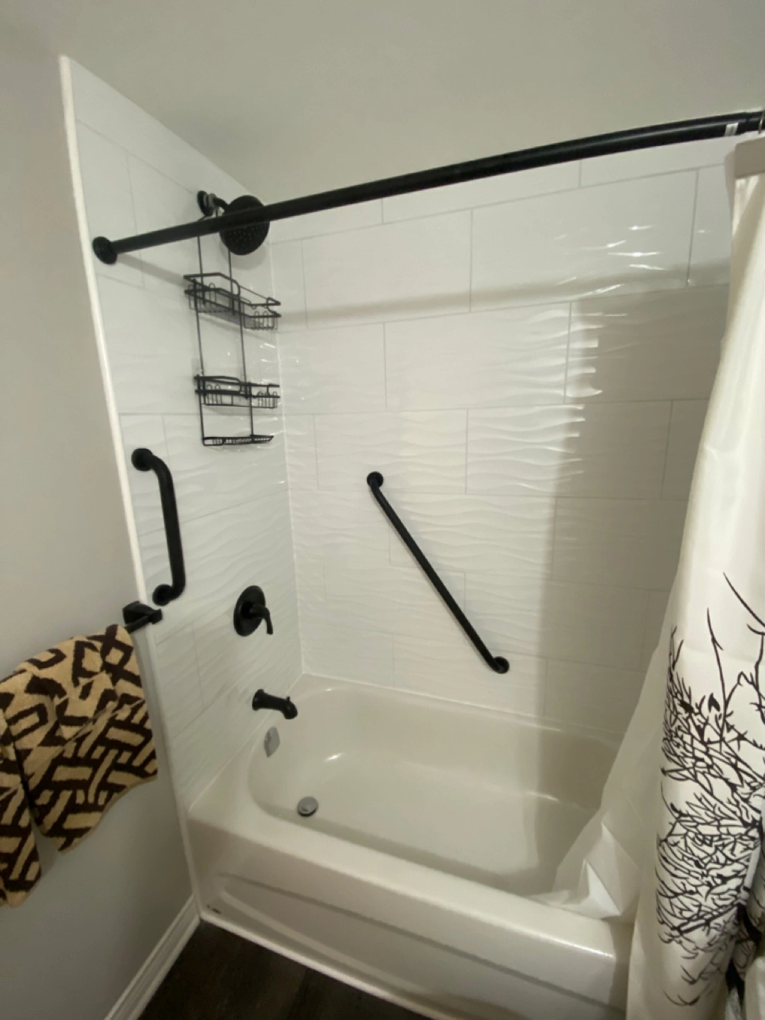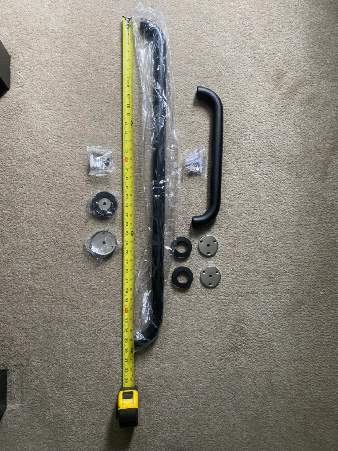 Selling a black bathroom grab bar set. It includes all the components and accessories you see in the picture. This set is perfect for adding safety and accessibility to your bathroom. It's in great condition and ready to be installed I purchased two sets of two grab bars but I only needed one of each length.