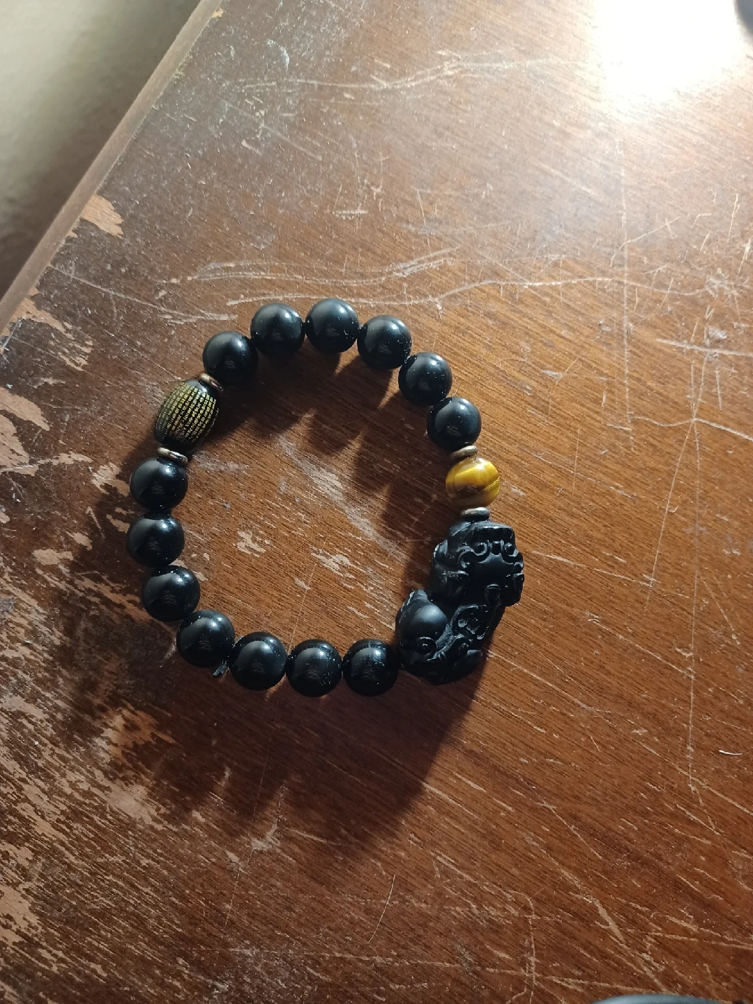 15Selling a beaded bracelet featuring black beads and a Pixiu charm. It's in great condition and would make a lovely accessory!