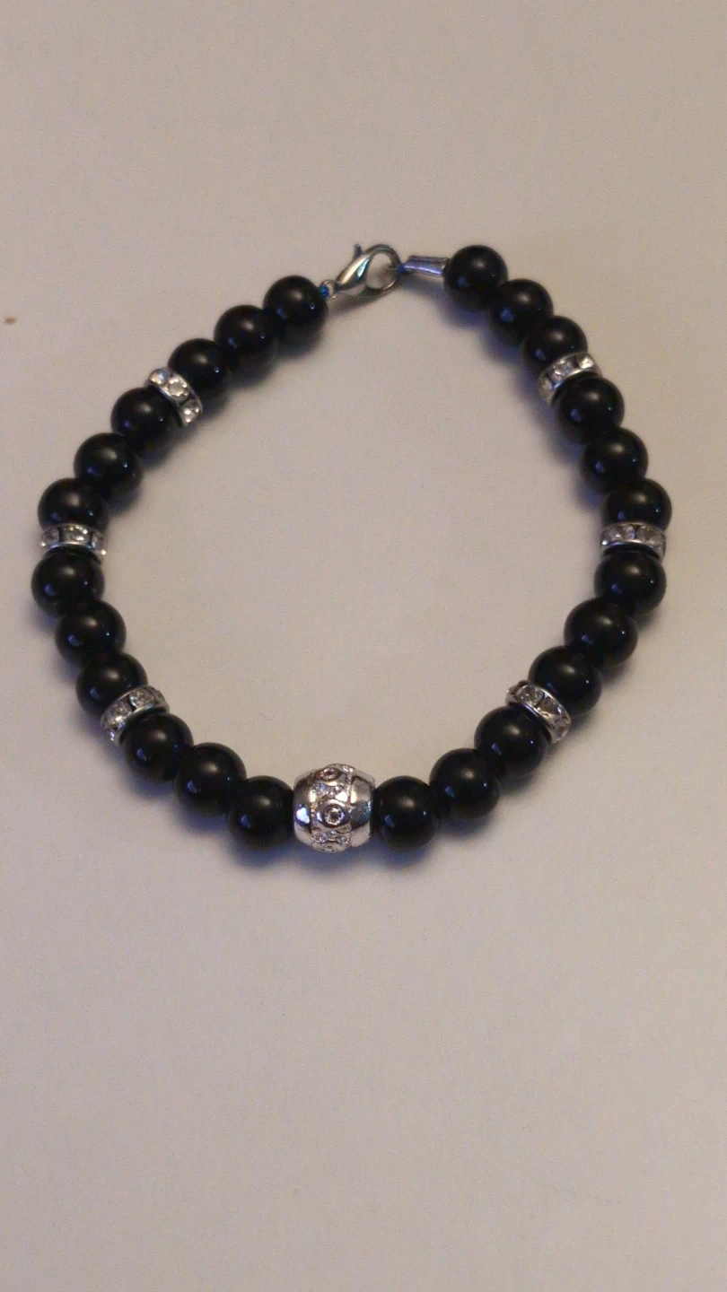 10Here's a lovely black beaded bracelet featuring silver accent beads and a decorative silver centrepiece. It's in great condition and ready to add a touch of elegance to your outfit!