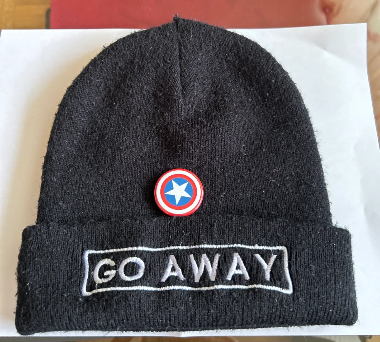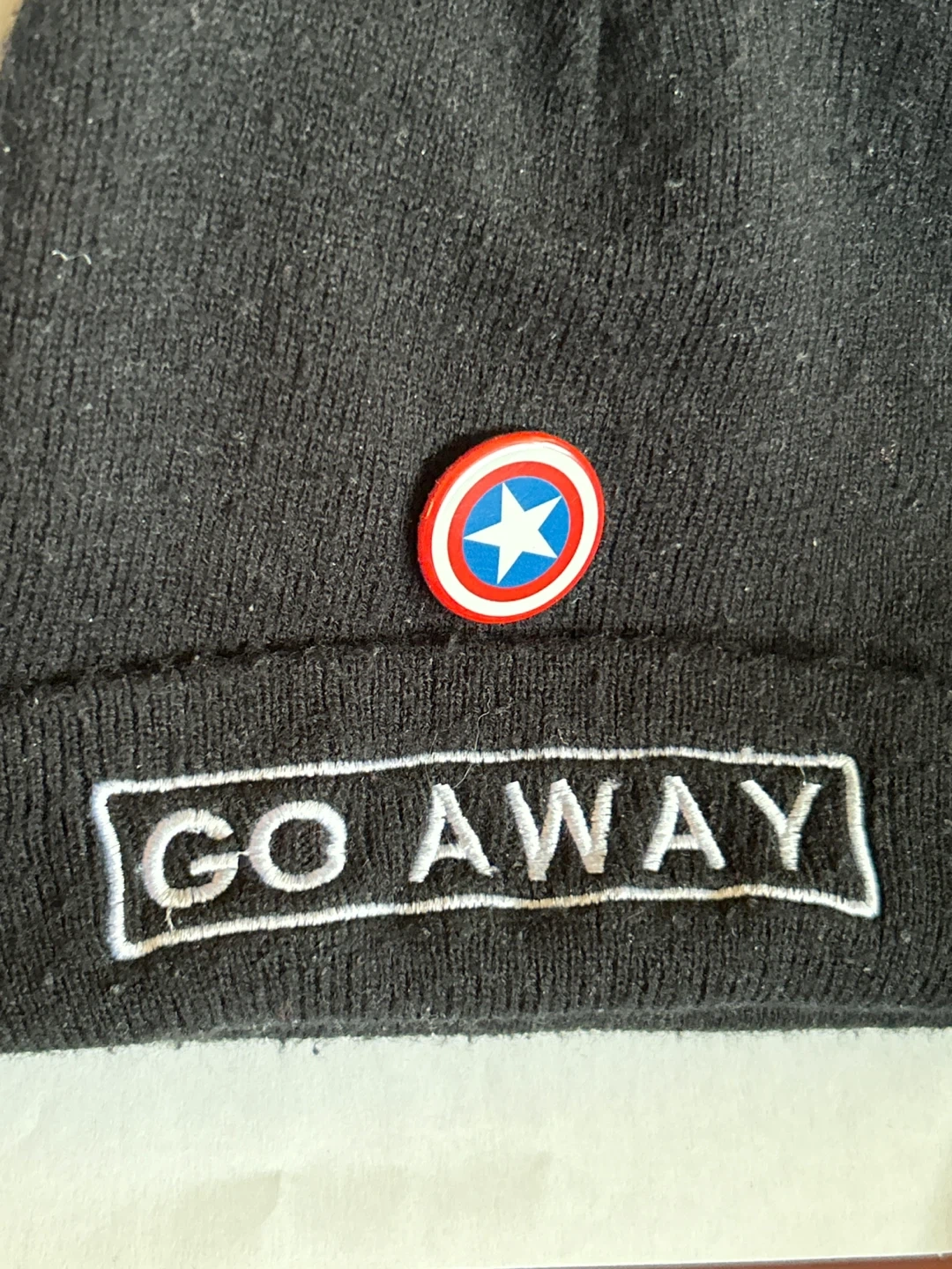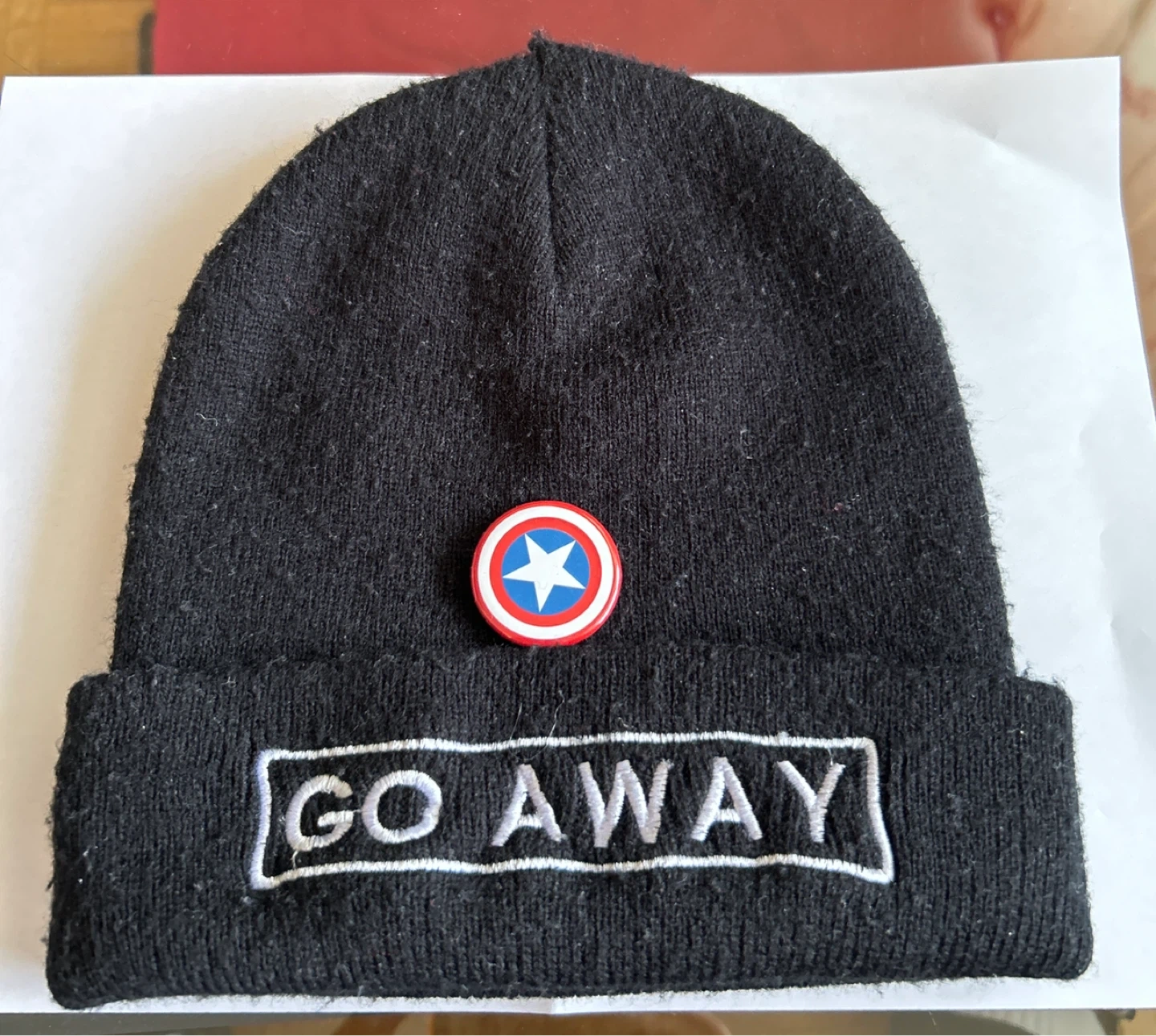1000+Selling a black beanie with the words "GO AWAY" embroidered on the brim. There's also a Captain America button on it. It's in okay condition and ready for a new home! Smoke/Pet free home. Cash & Pick up only.