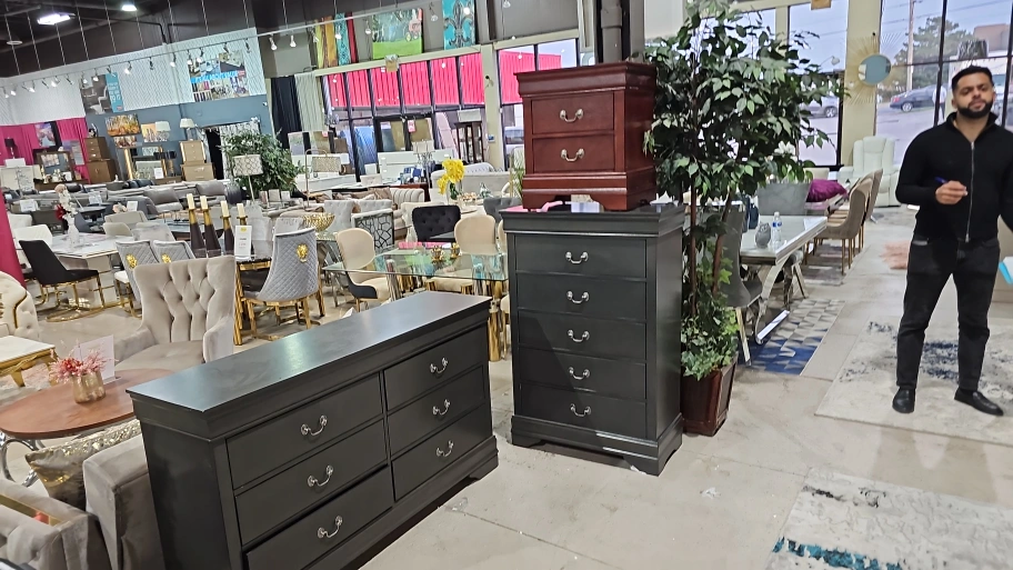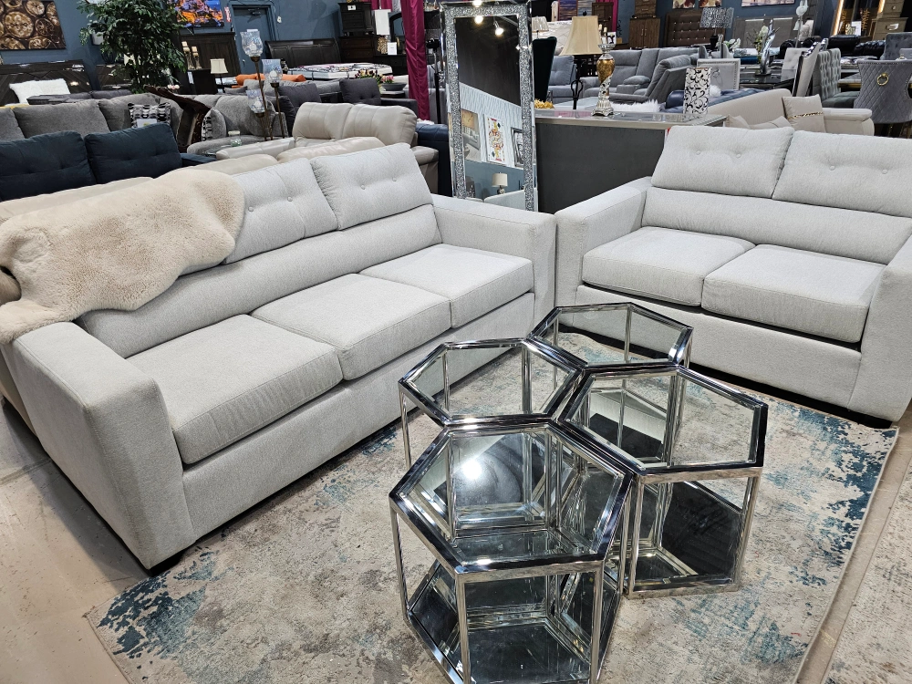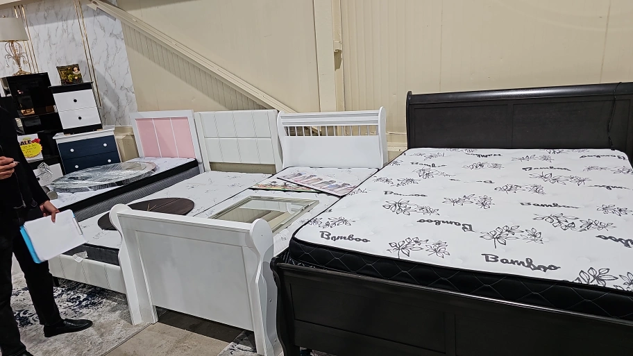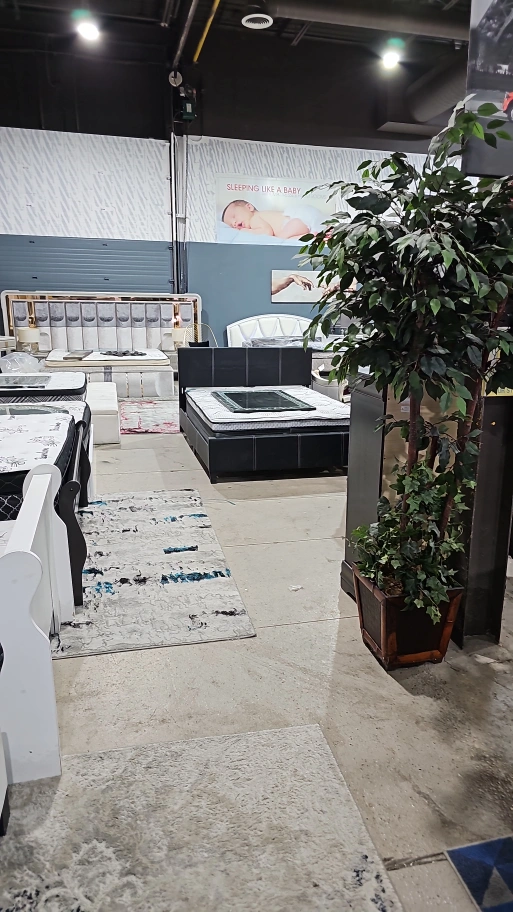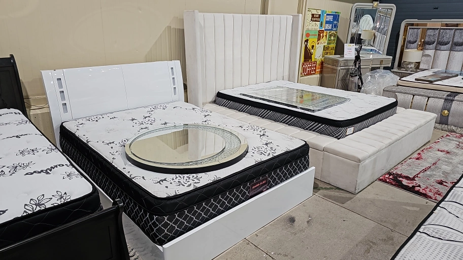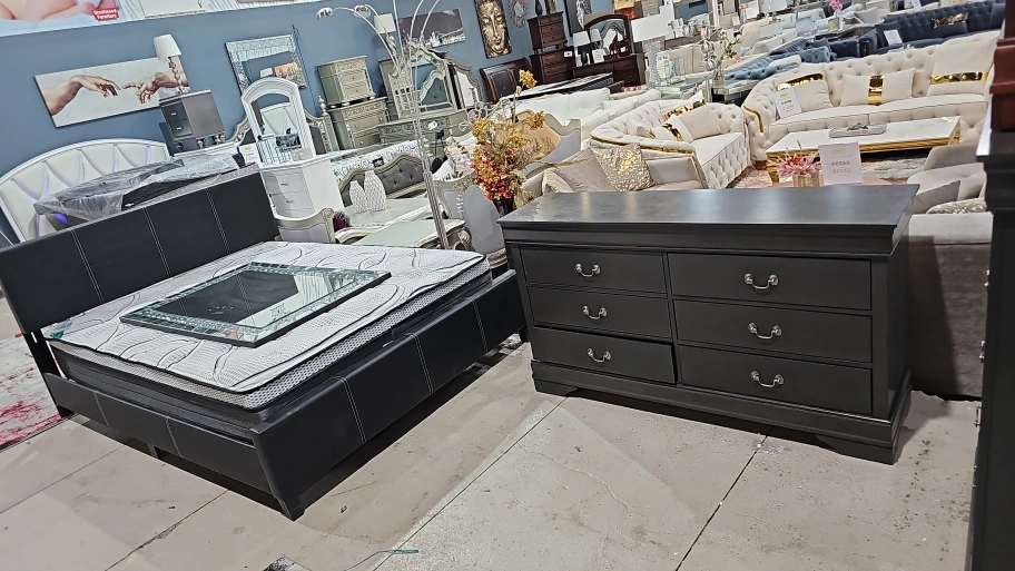 5The bed frame is in a black leatherette material and has a tufted headboard. The mattress comes with a pillow-top and has a white, black, and gray colour scheme. The mattress also has a mirrored centre panel. sofas. sectionals. sofa bed. ottomans. dining. chairs. living room. family room. anything you need 80% off clearance.