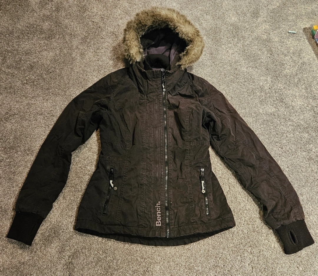 28Women's black Bench jacket with a faux fur hood, (removable fur) zipper closure, and two zippered pockets. Warm for fall and winter use. Thumb holes.
