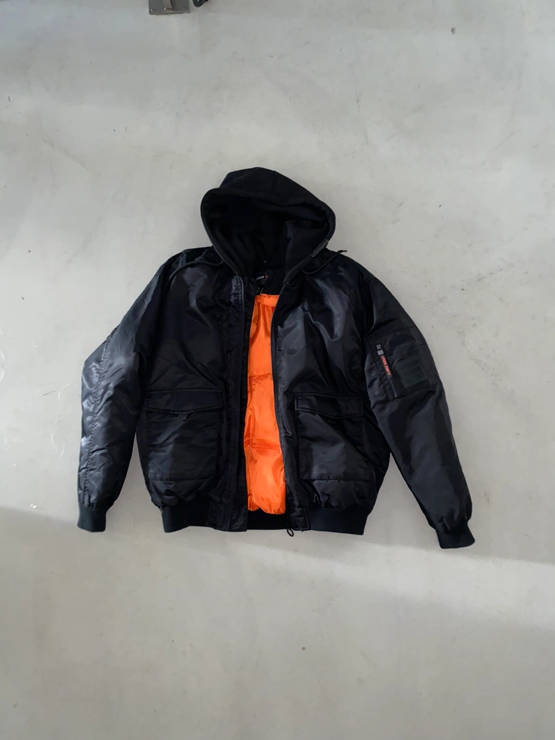 71I have a black bomber jacket for sale. It has a hood and an orange lining. It's in great condition!