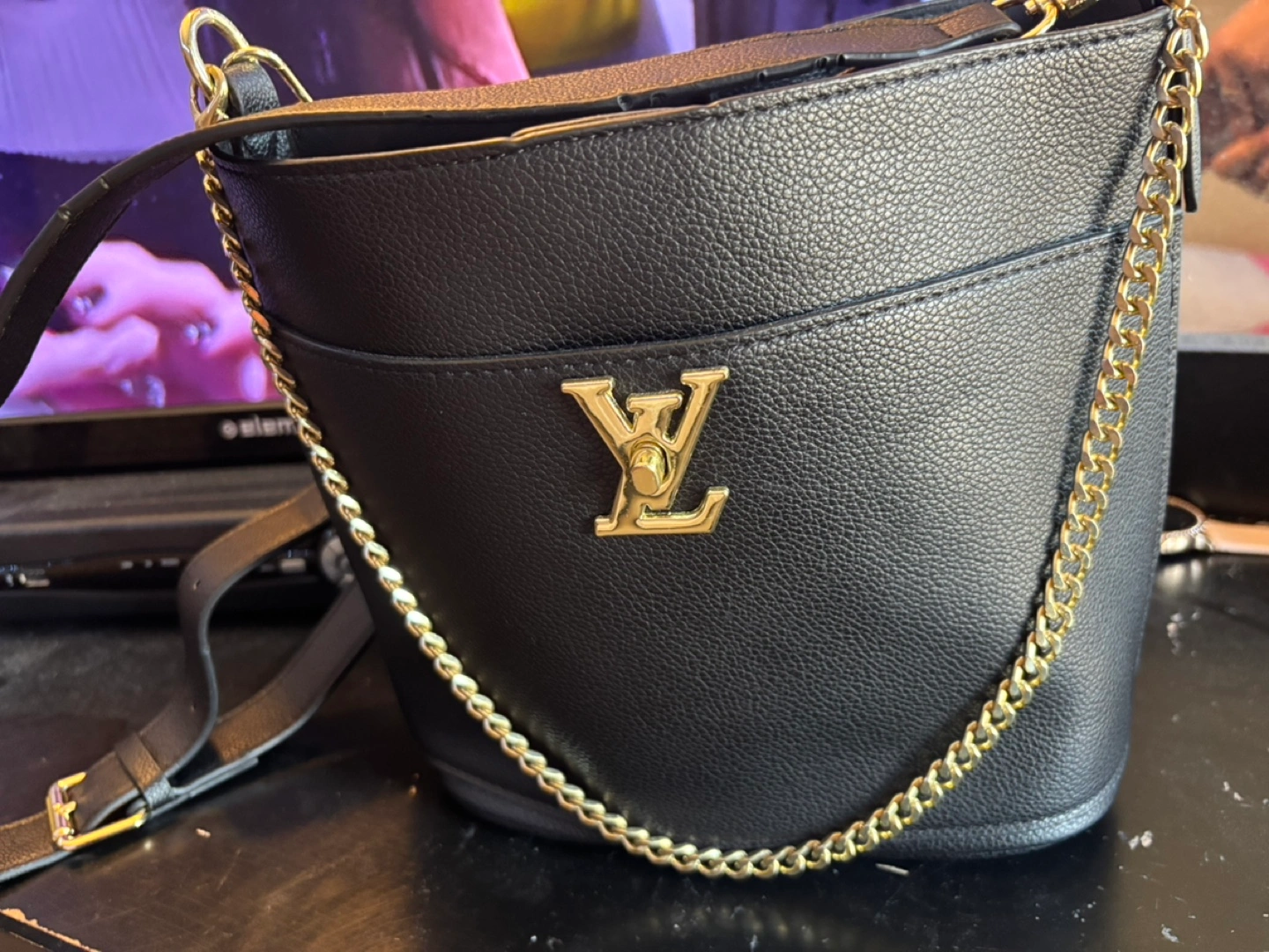 23Small black bucket bag. Features a gold chain strap and gold logo. Leather-like material.