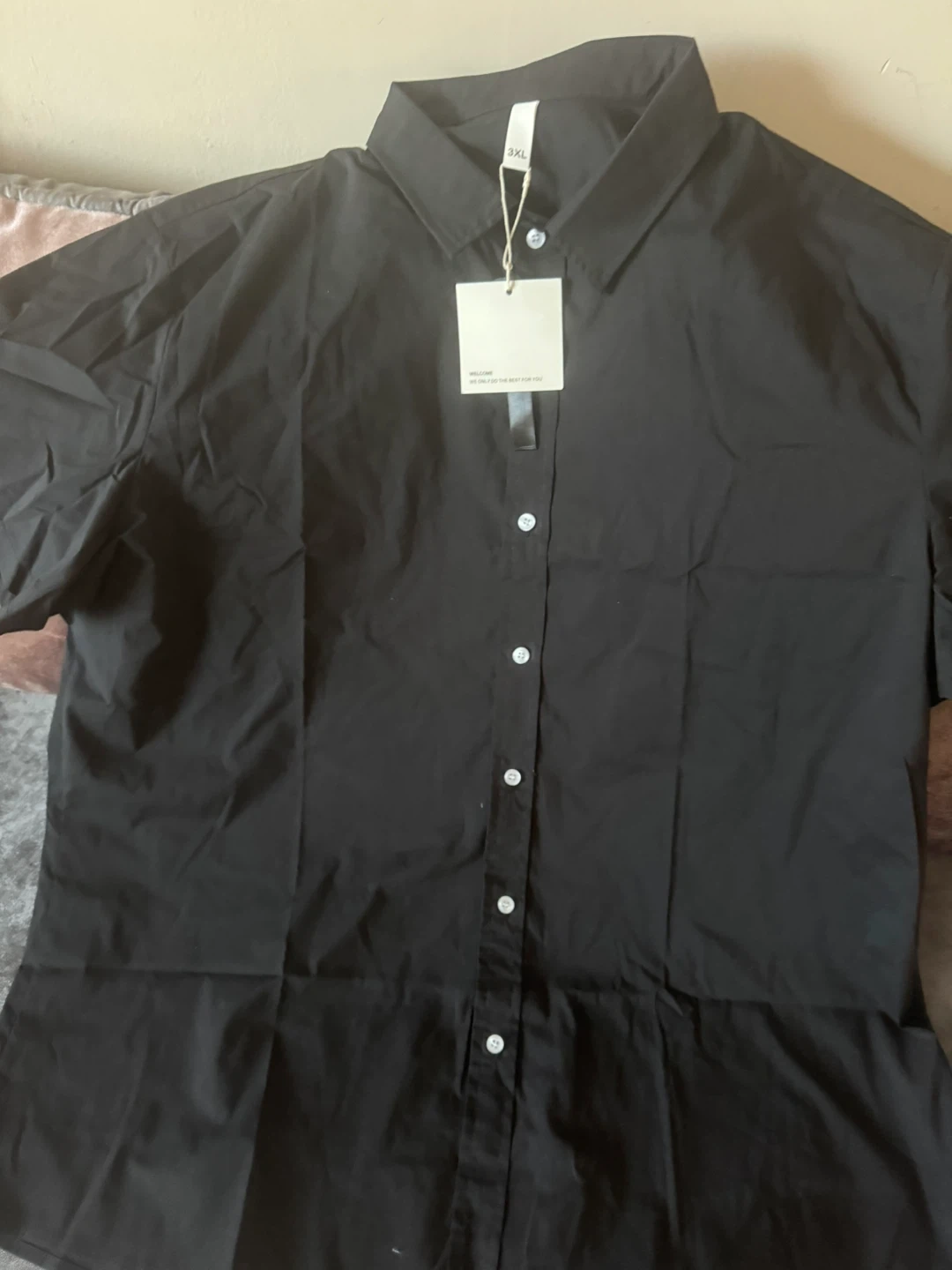 Selling a black button-down shirt in size 3XL. It appears to be in new condition with the tags still attached. Perfect for a casual or more dressed-up look!
