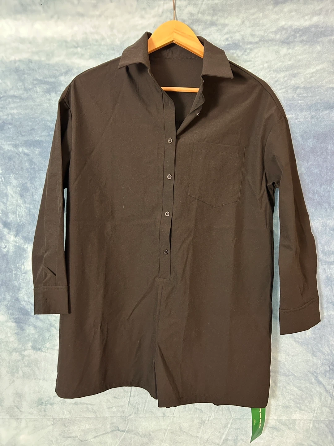 477This is a SHEIN shirt romper in black, new with tags. It's a size small and in great condition! Perfect for a casual or dressed-up look. Would recommend adding a belt for a more tailored look.
