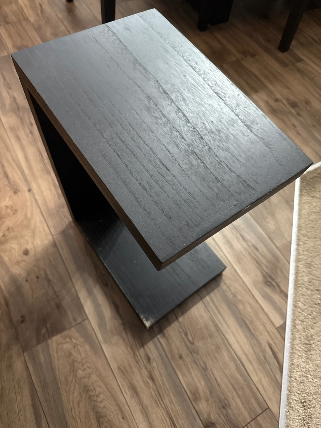 60Selling a simple black C-shaped side table. It's great for small spaces or as an accent piece next to a couch or chair. There are some signs of wear, as shown in the pictures, but it's still sturdy and functional