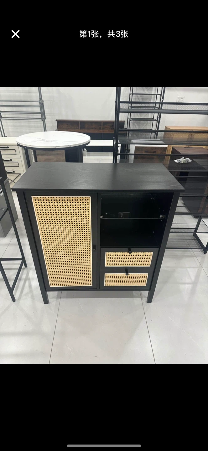 Selling a stylish black cabinet featuring a rattan door and drawers. It's a great piece to add some texture and storage to any room. The cabinet has a modern look with a touch of natural material, making it a versatile addition to your home decor
