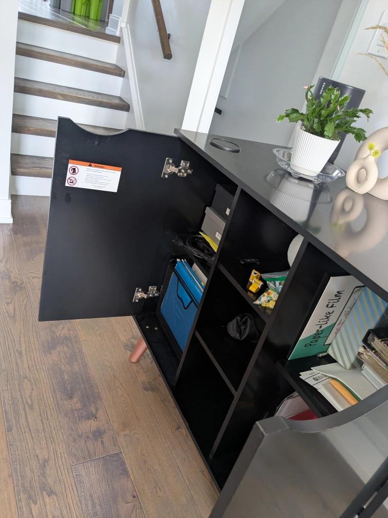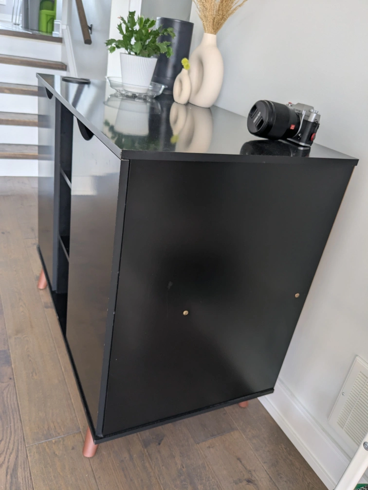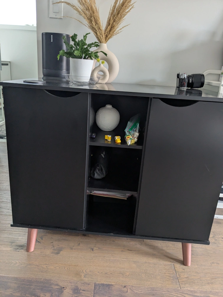 Selling a black cabinet with storage space. It's in great shape and ready for a new home! Perfect for organizing your living room, bedroom, or any space that needs a little extra storage. Mid-century modern style accent cabinet with splayed legs, 2 doors, 1 shelf inside each side, 3 Cubby Spaces in the middle. Measures: 33.07 in. Length, 25.59 in. Height, 15.75 in. Depth. Made of High Quality MDP with Painted Finish and Finished Back.