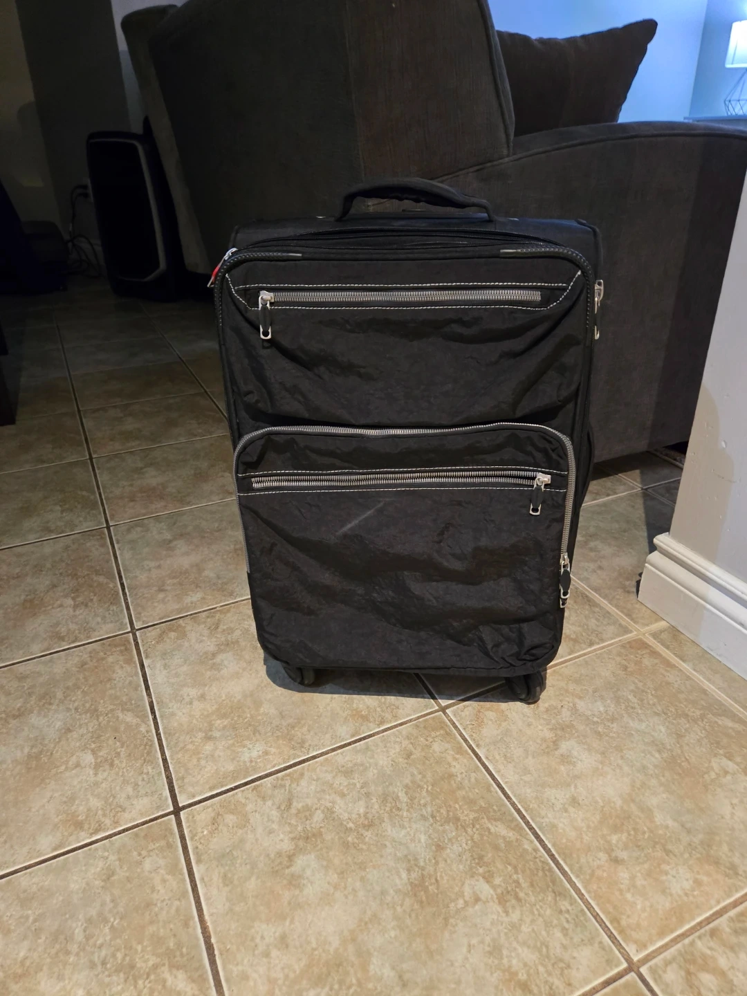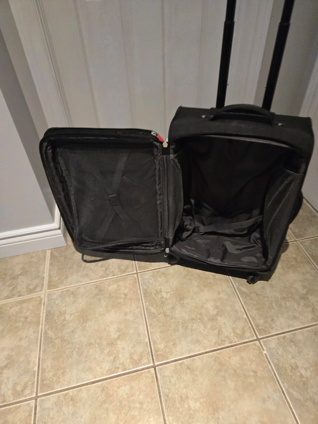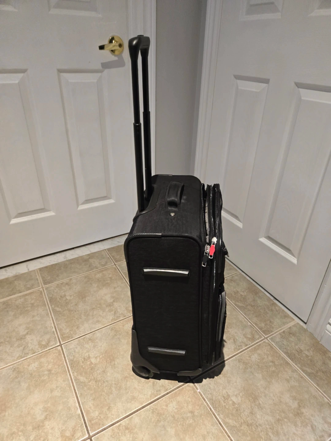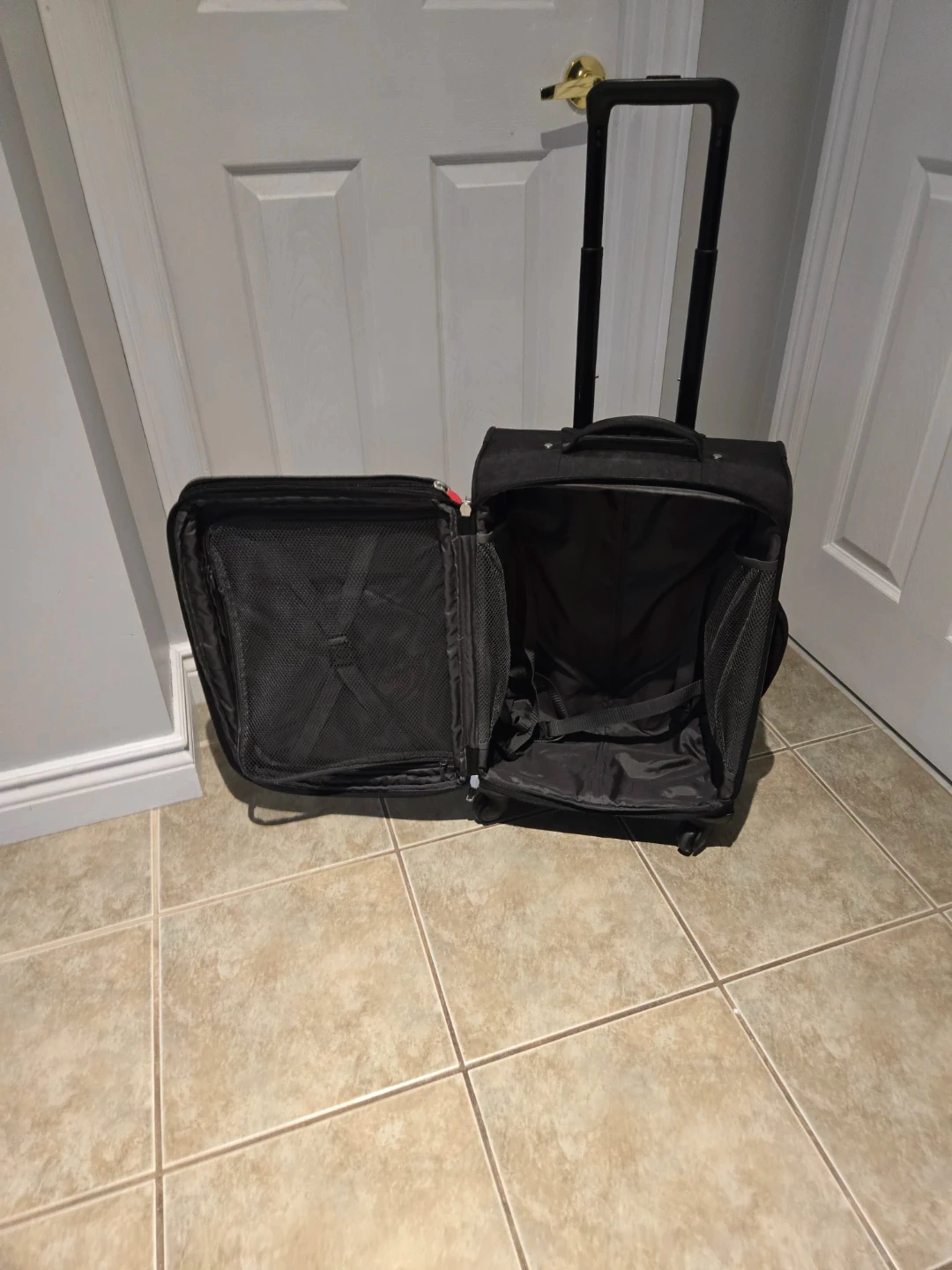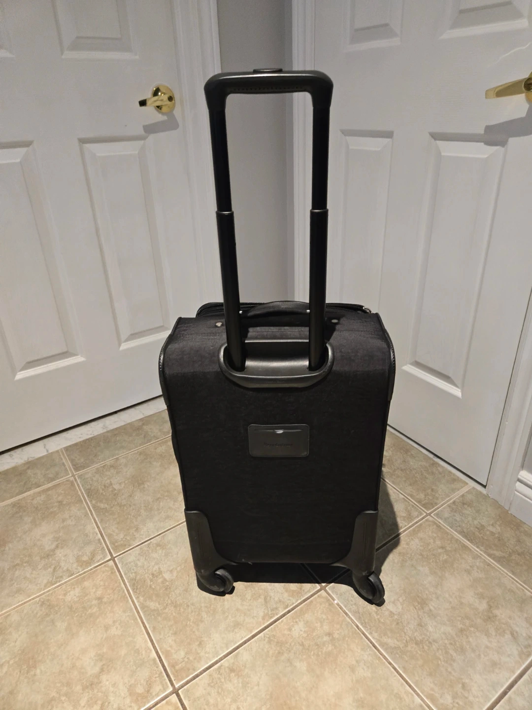 10Soft shell carry-on suitcase with wheels and telescopic handle.