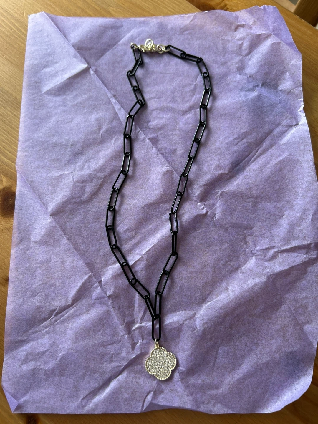 101Selling a stylish black chain necklace featuring a clover pendant with cubic zirconia.