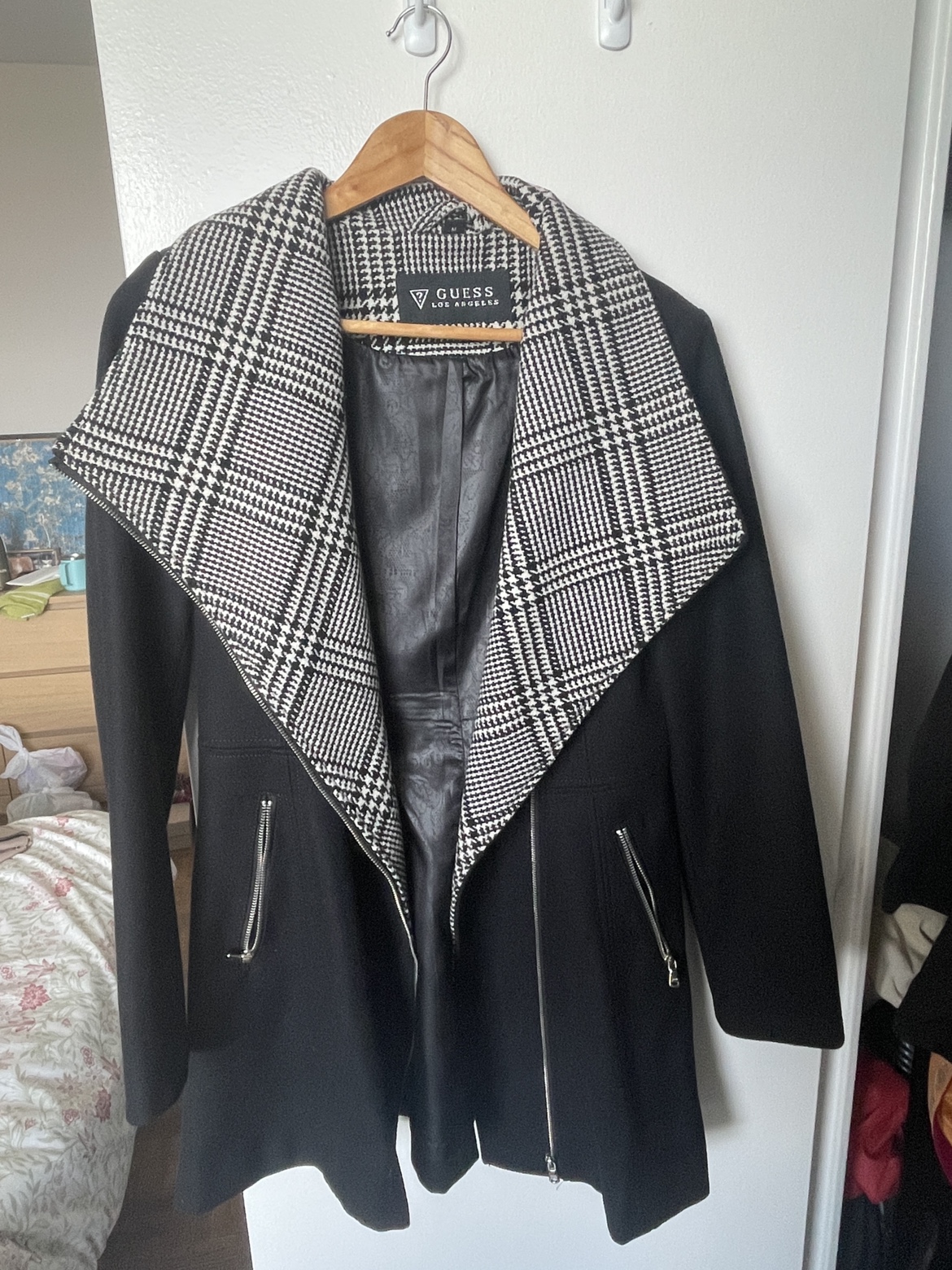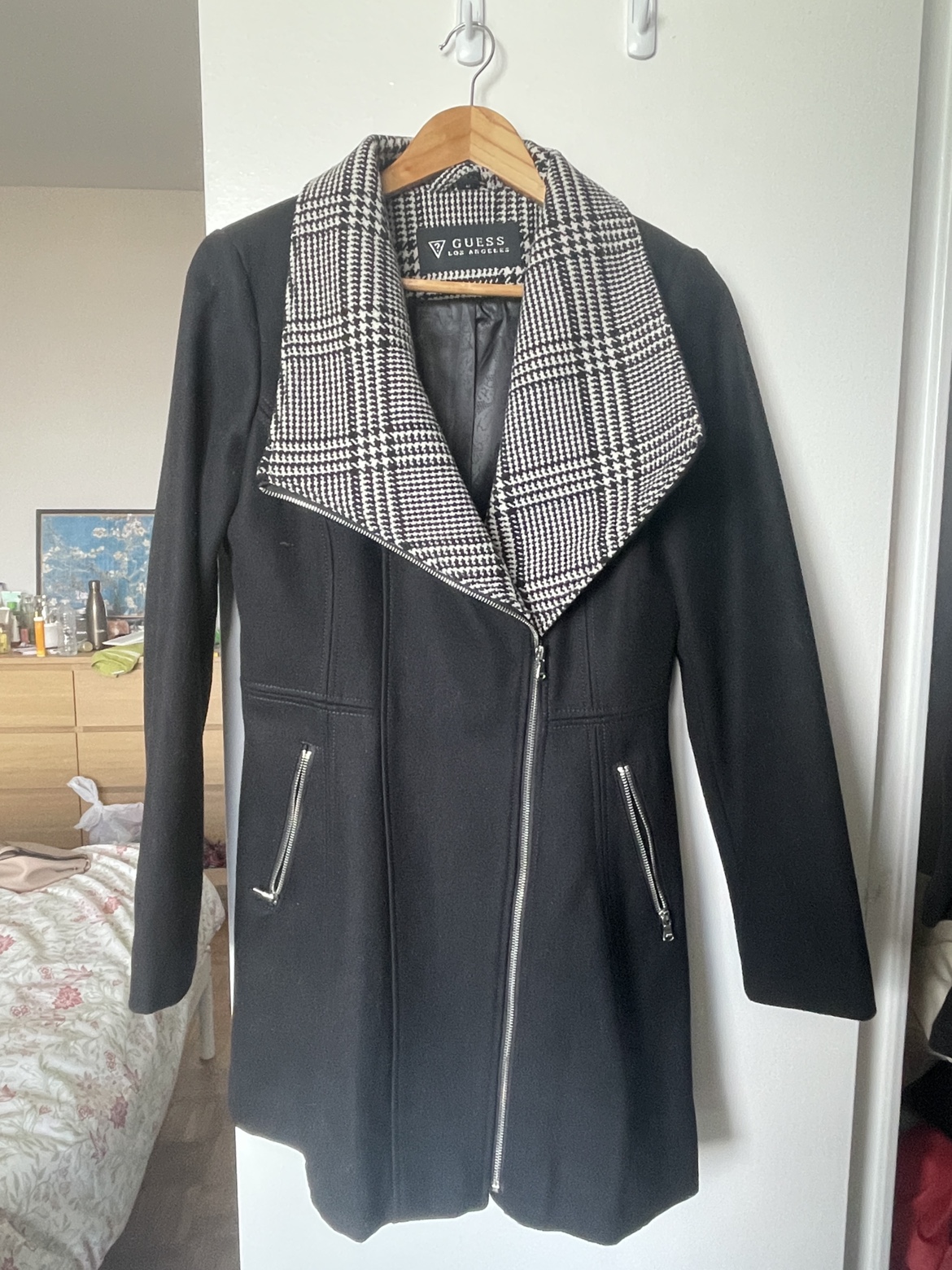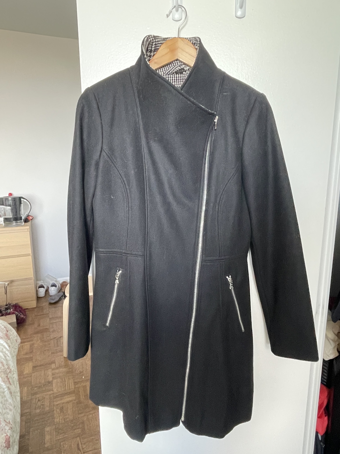 12Black coat. Warm. 60% wool, 30% polyester. Barely worn. Looks like new.