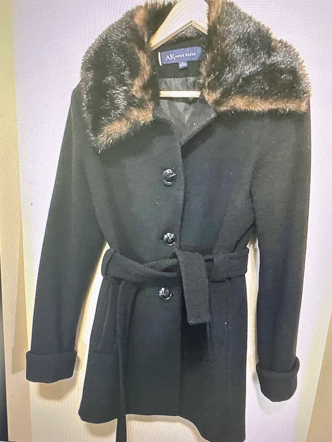 Black coat with a fur collar and a self tie belt. The coat is in excellent condition. Size small Comes from a pet and smoke free home Xposted pickup highway 7, Halton hills, Acton