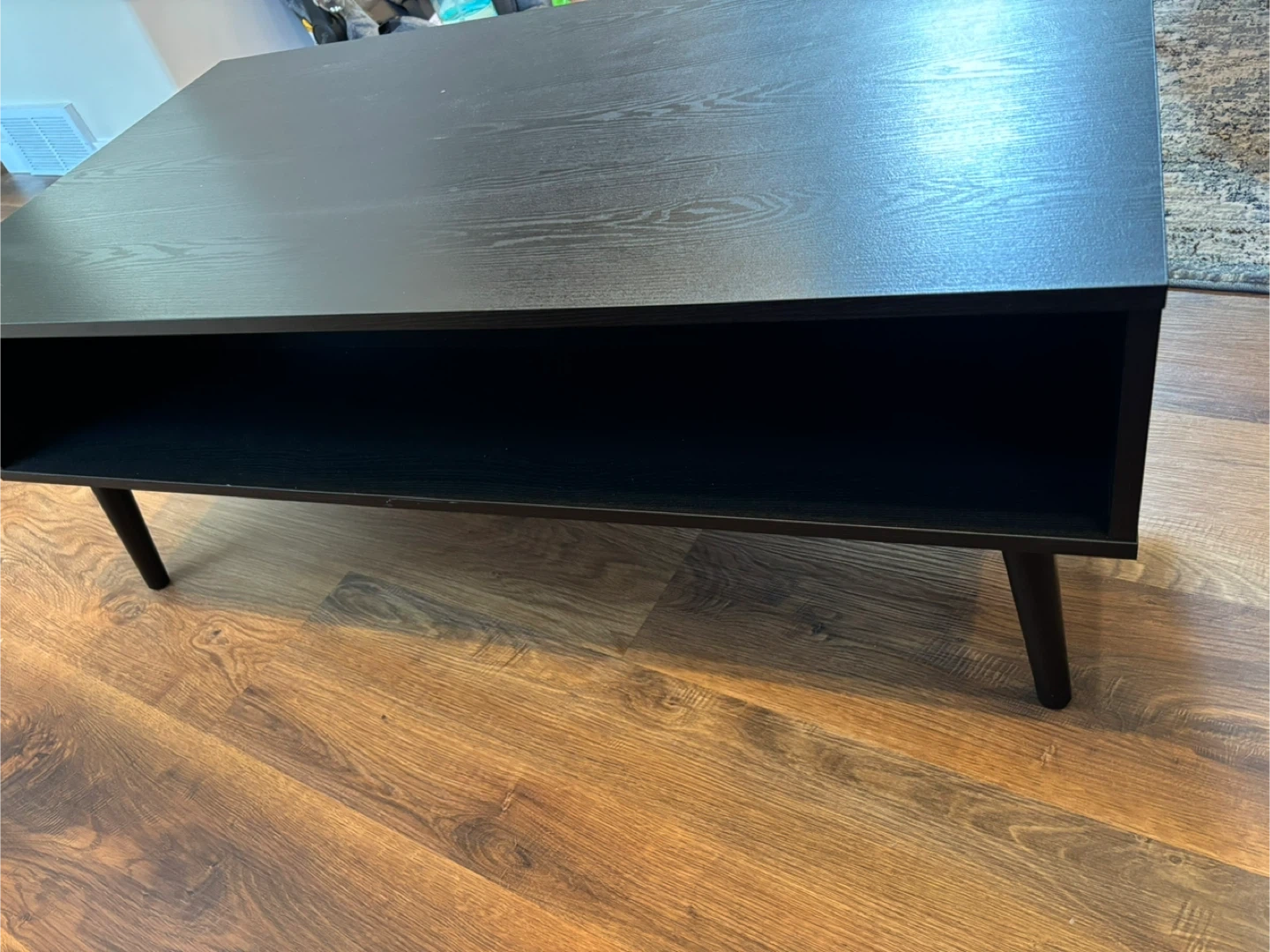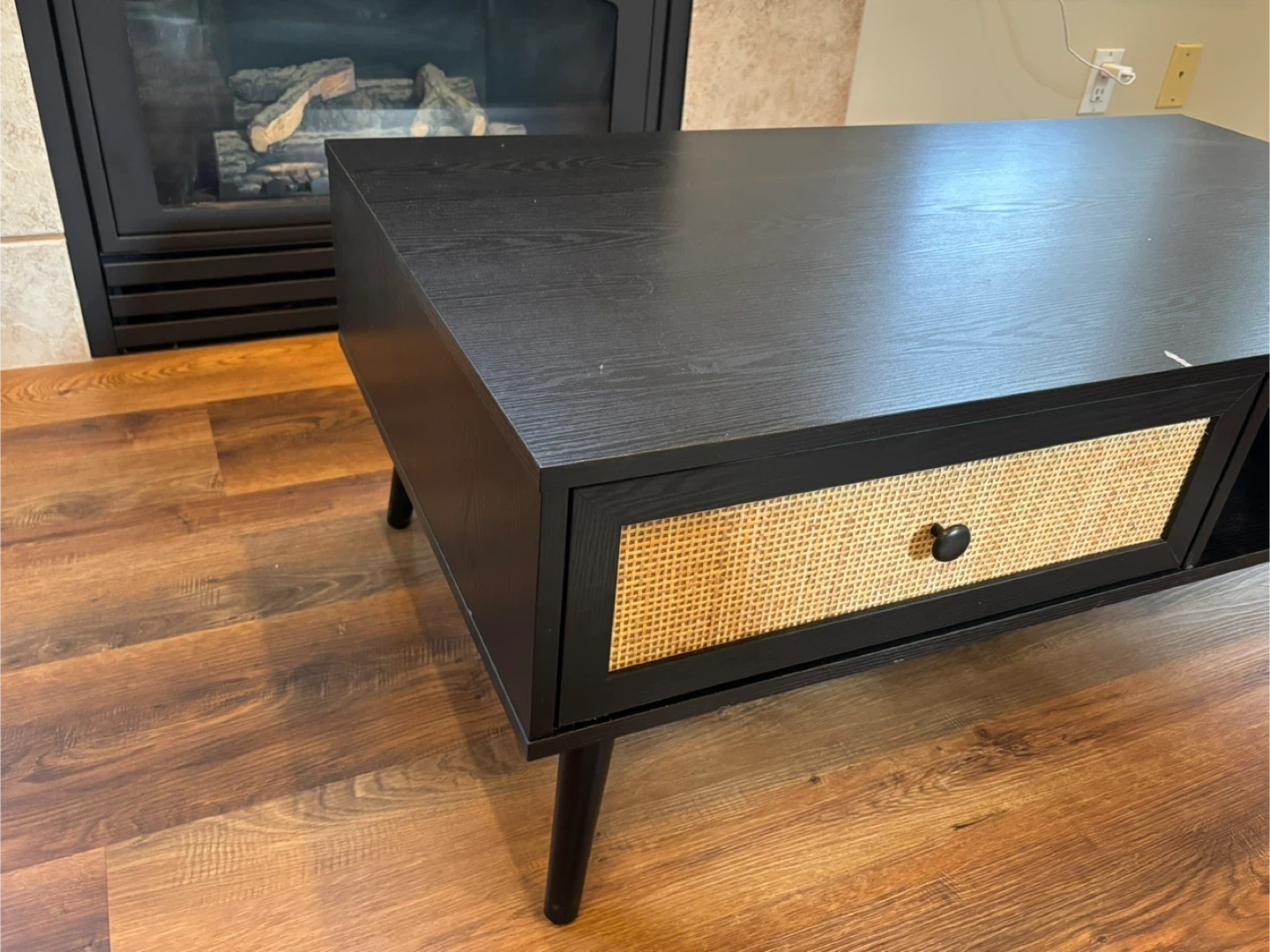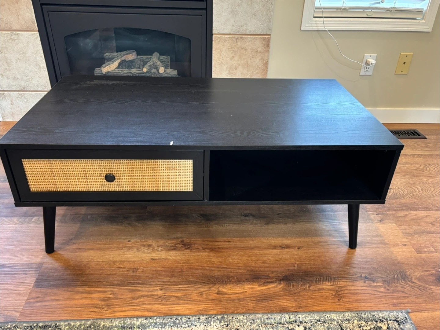 Selling a stylish black coffee table! It features a sleek design with a rattan drawer, adding a touch of natural texture to your living space. Perfect for any modern or contemporary home decor.