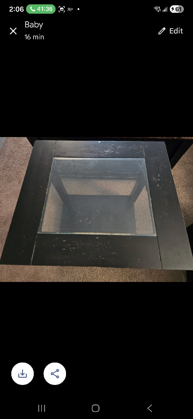 10Selling a black coffee table with a glass top. It has a bit of wear and tear, as you can see in the photos, but still has lots of life left in it! It also has a shelf underneath for storage Great for someone starting out or a DIY project. smoke free and clean home