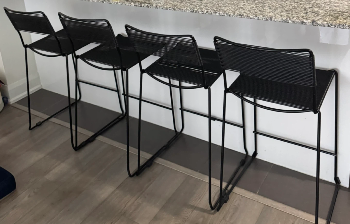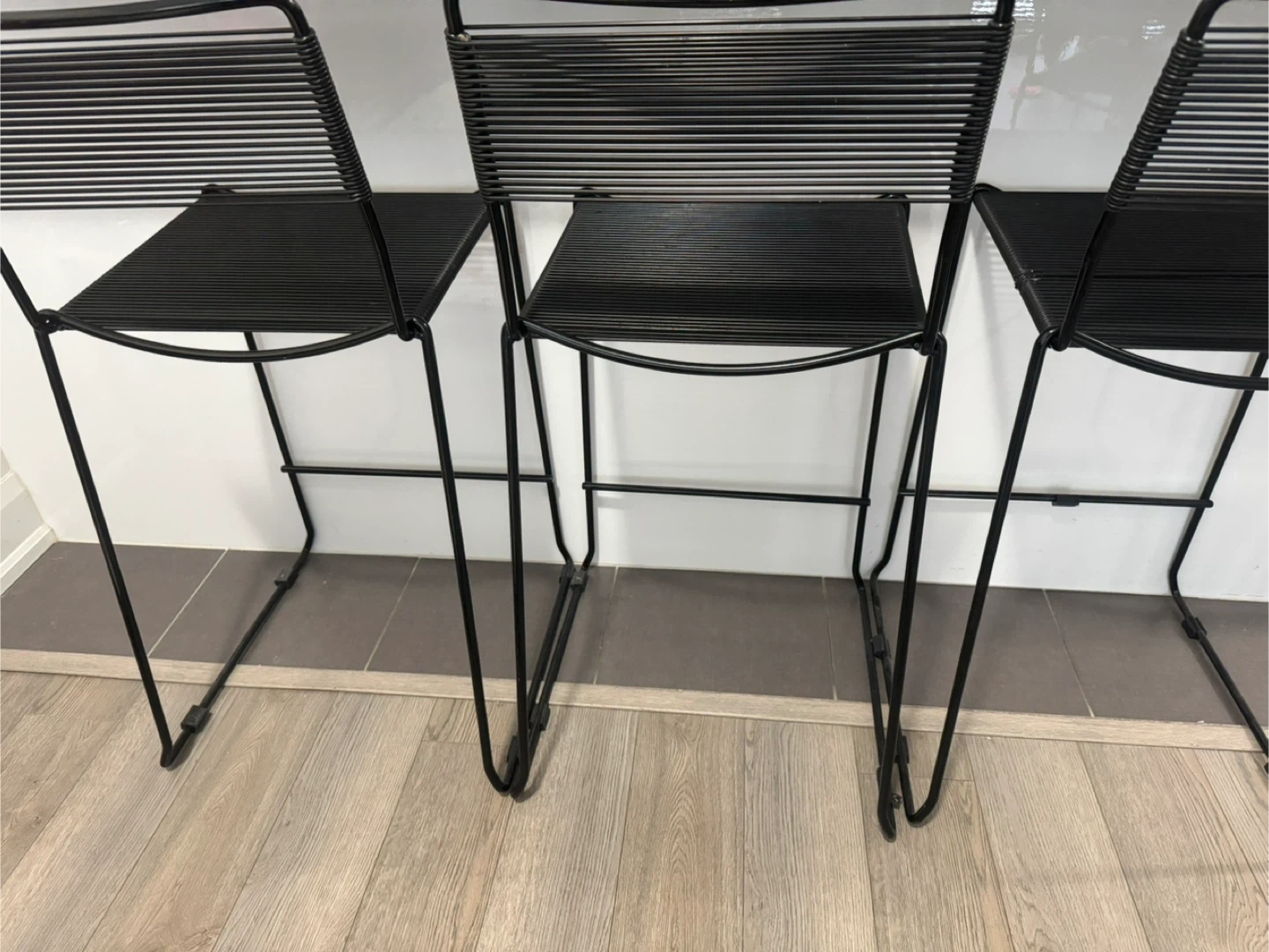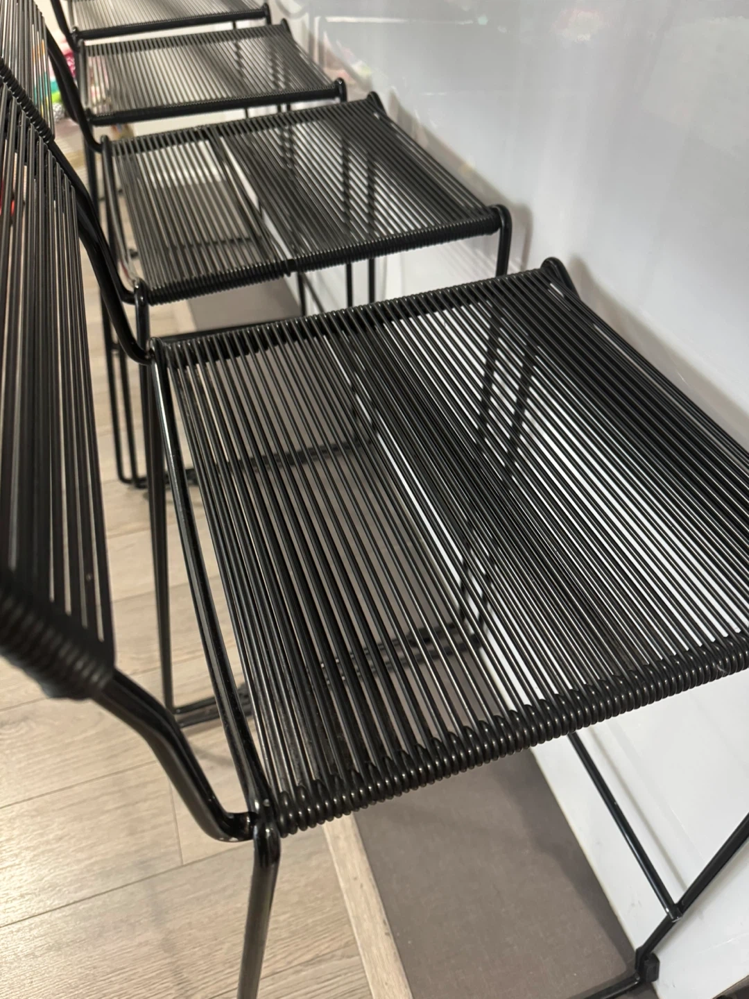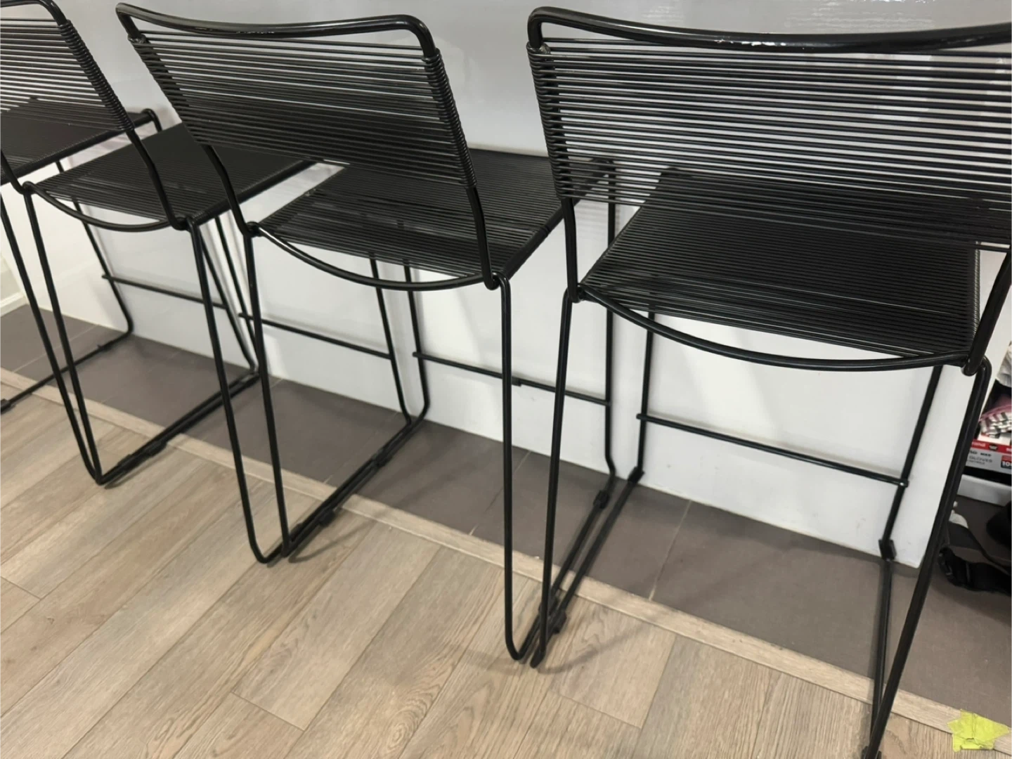 Selling a set of four vintage sleek black cord bar stools (spaghetti chairs). 3 are in good shape and one is in fair condition that was repaired (ask for more photos) would look fantastic in any modern kitchen or bar area. The minimalist design and black colour make them versatile and easy to match with any decor. Perfect for adding extra seating to your space! $400 each