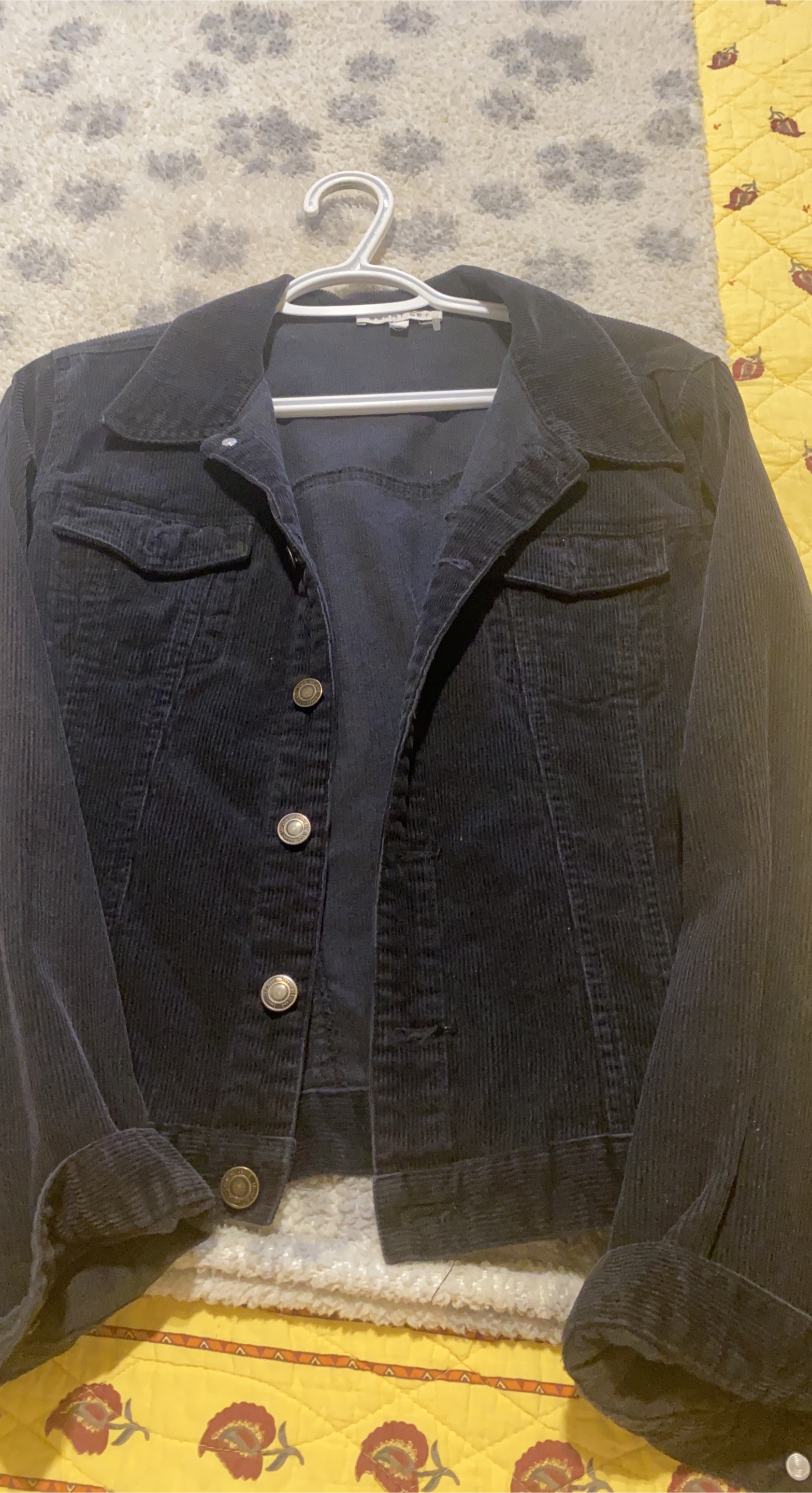 Dark-colored corduroy jacket. Features a button-up front with two breast pockets. It is perfect for chilly evenings.