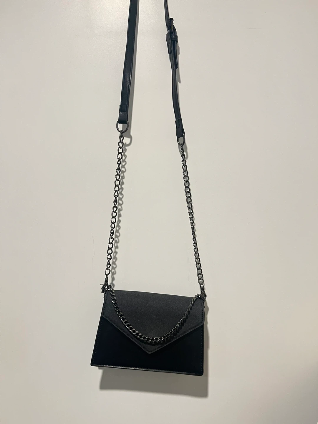 7818cm wide, 11cm height, 5cm depth Selling a stylish black crossbody bag! It features a chic chain detail and is perfect for carrying your essentials. The bag is in great condition and ready for a new home. It's a versatile accessory that can easily be dressed up or down for any occasion Cash only Pickup only